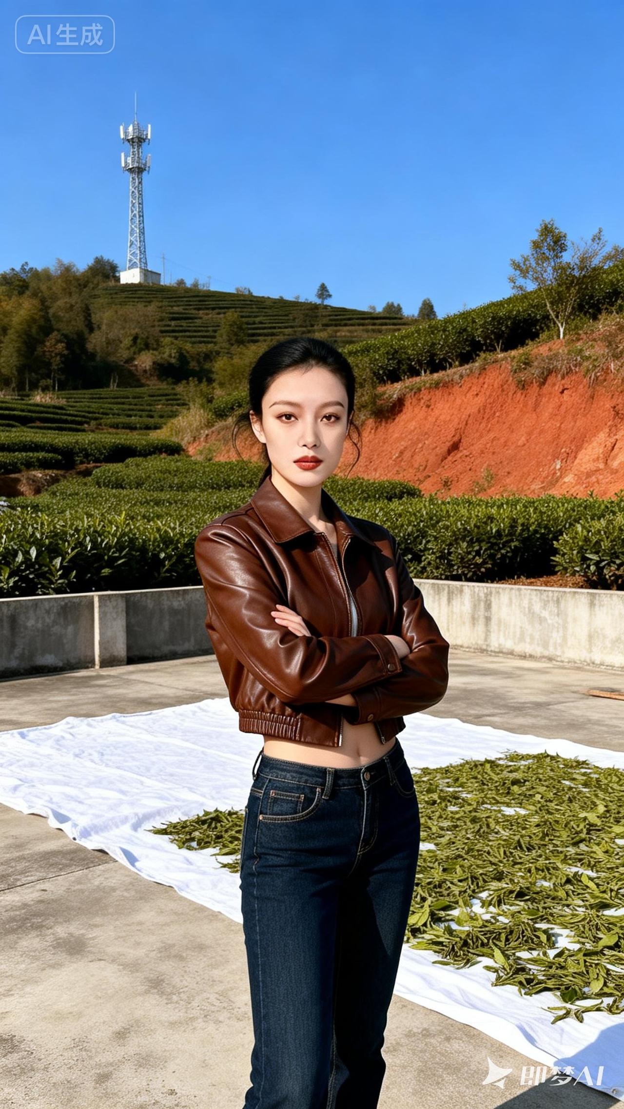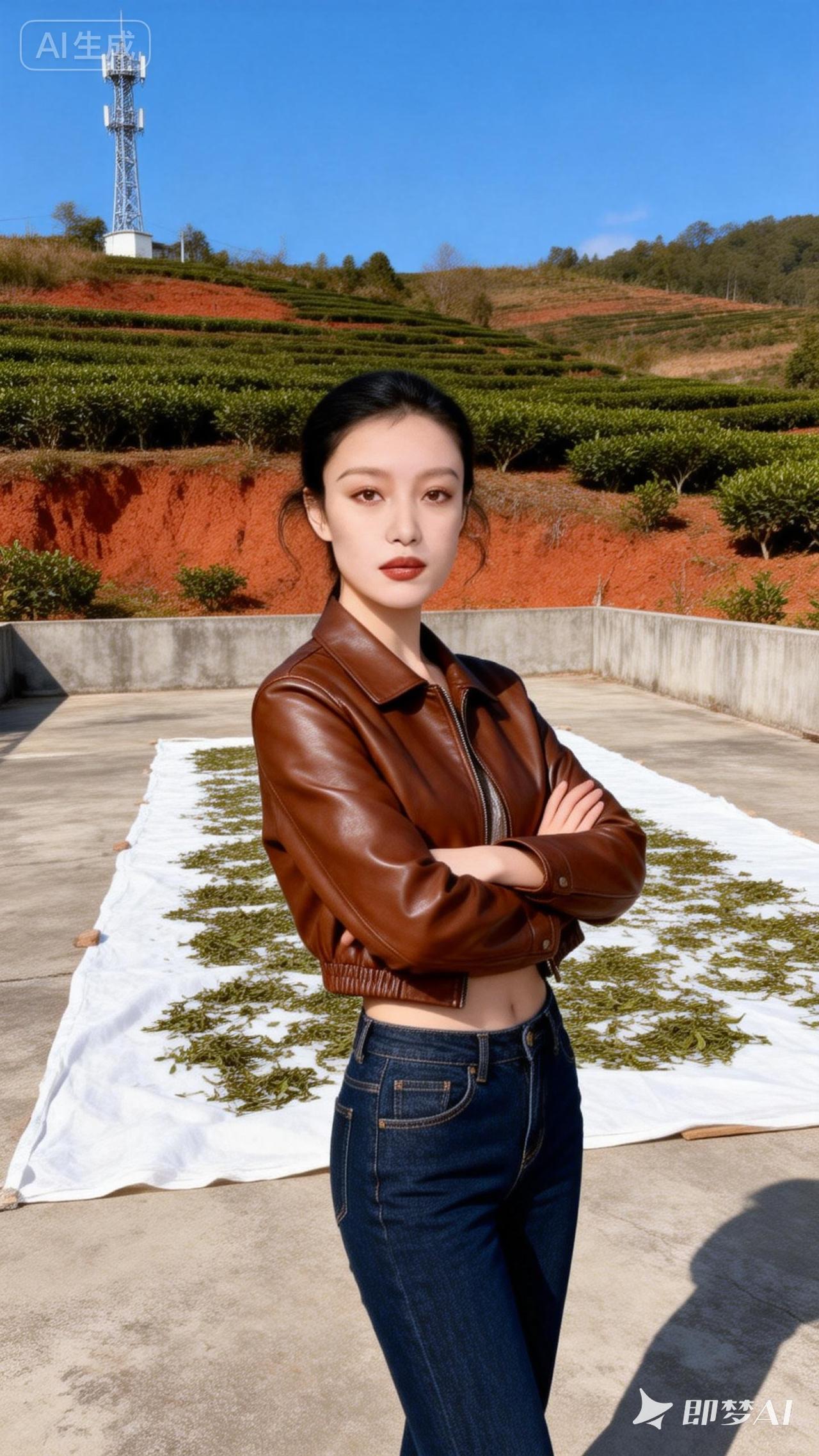 秋日茶园漫步,棕色皮衣与自然景色相得益彰。
