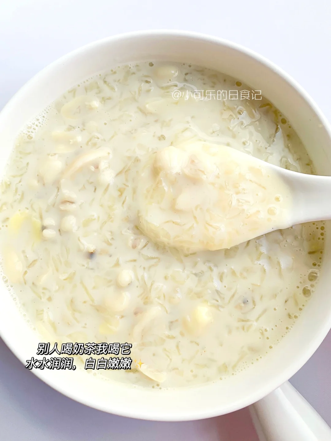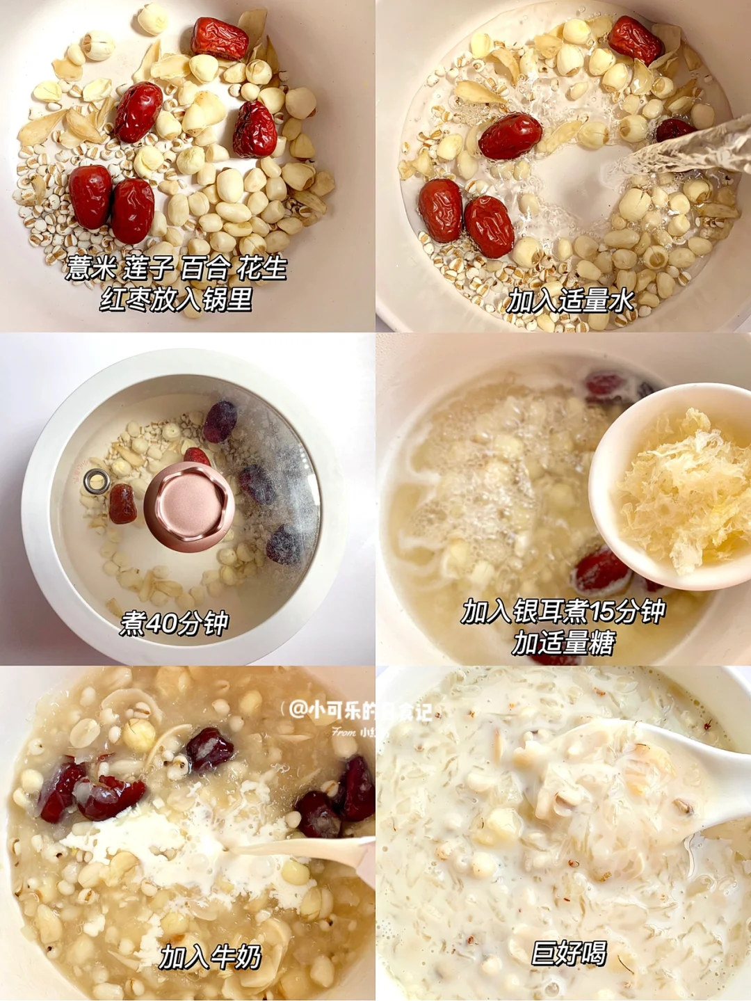 姐妹们,把奶茶换成这个,坚持喝真的会美白养颜,内调真的很重要,想要白白白的姐妹赶紧喝起来,当作早餐也很不错哦[偷笑R][偷笑R] 👩🍳做法 1⃣️薏米、花生、百合、莲子、红枣,放入锅里煮40分钟 2⃣️加入银耳煮15分钟,加适量冰糖,最后倒入牛奶/椰汁都可以 🌈合适家里没有破壁机的姐妹,熬成粥也是很好喝哦,拿来当早餐都很不错哦