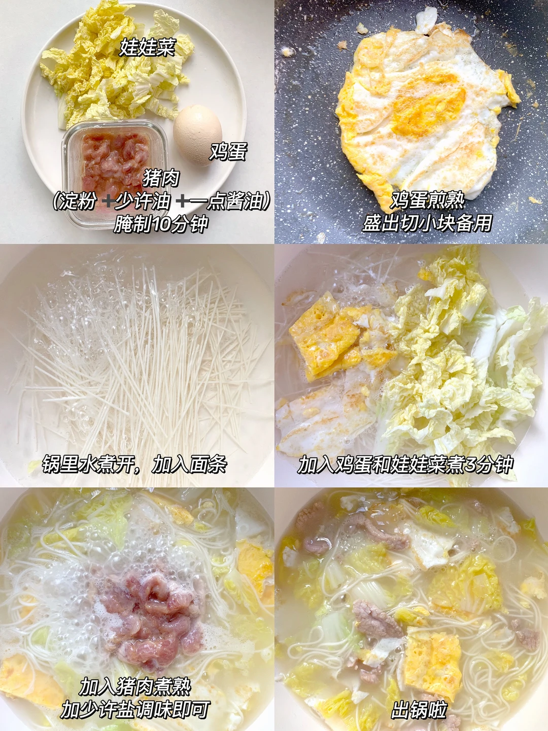 2⃣️锅里加水煮开加入面条,鸡蛋和娃娃菜煮三分钟,加入猪肉煮熟加点盐调味即可