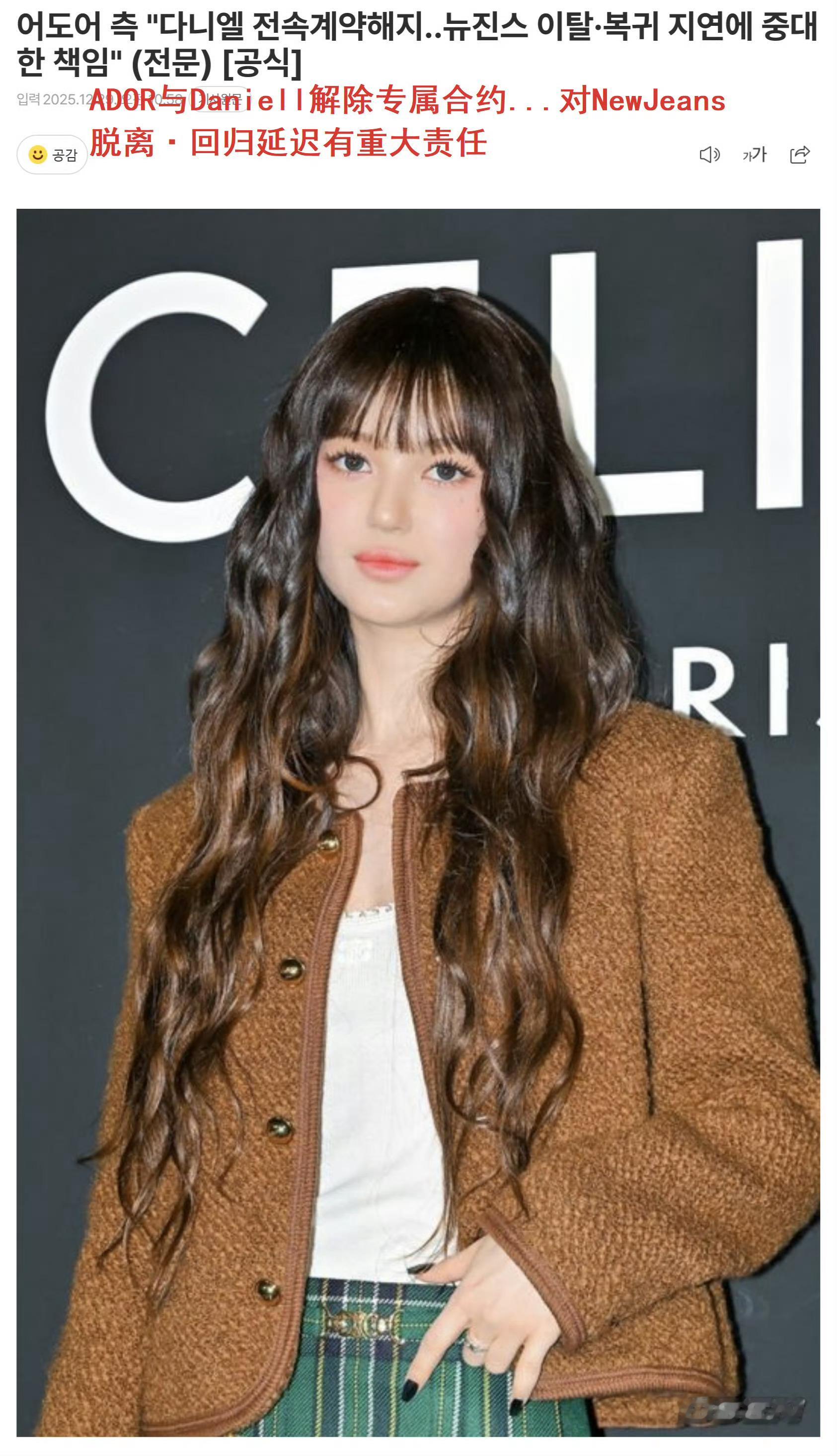 251229 Danielle被解约韩媒报道,HYBE近期正在准备发布关于Hanni和Minji回归的官方声明,决定以违反专属合同条款等理由,仅与Danielle解除专属合同,这是对Danielle的报复性解约ADOR回应:在专属合同有效性确认,诉讼判决生效后,与Minji、Hanni、Daniell以及其家人进行了多次对话。Hanni决定继续与ADOR同行,Minji还在讨论中,Daniell将离开团队。本公司认为她难以继续作为NewJeans成员及ADOR所属艺人进行活动,因此已于今日通知解除其专属合同,并计划于今日内提交违约金及损害赔偿诉状。此外,对于导致此次纠纷、并对NewJeans脱离与回归延迟负有重大责任的一名Daniell家人及前代表闵熙珍,本公司将追究其法律责任。