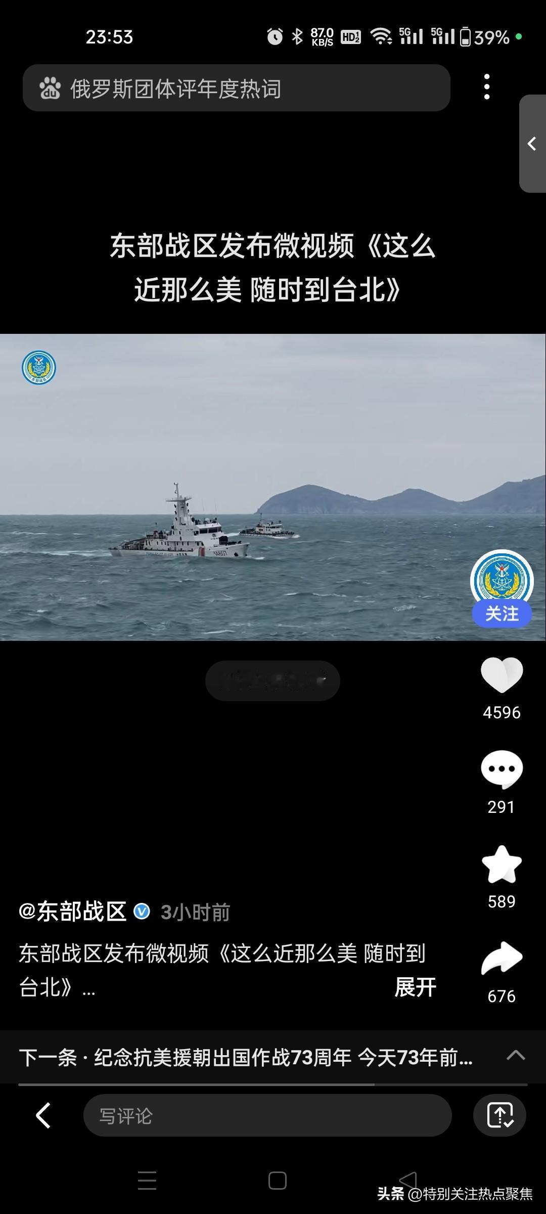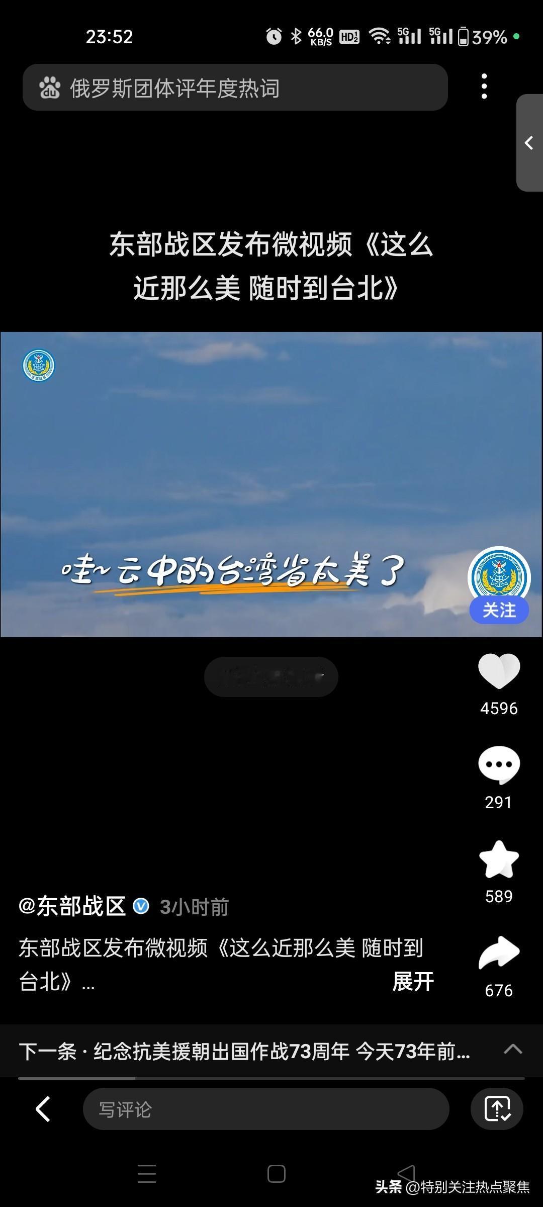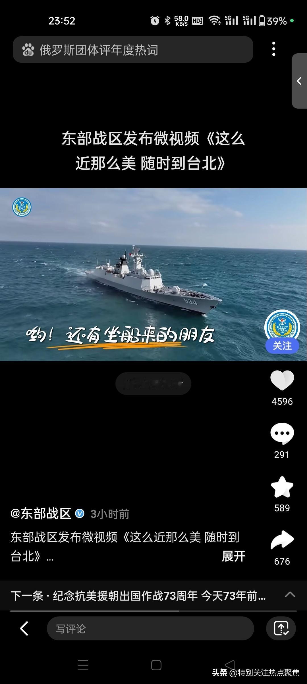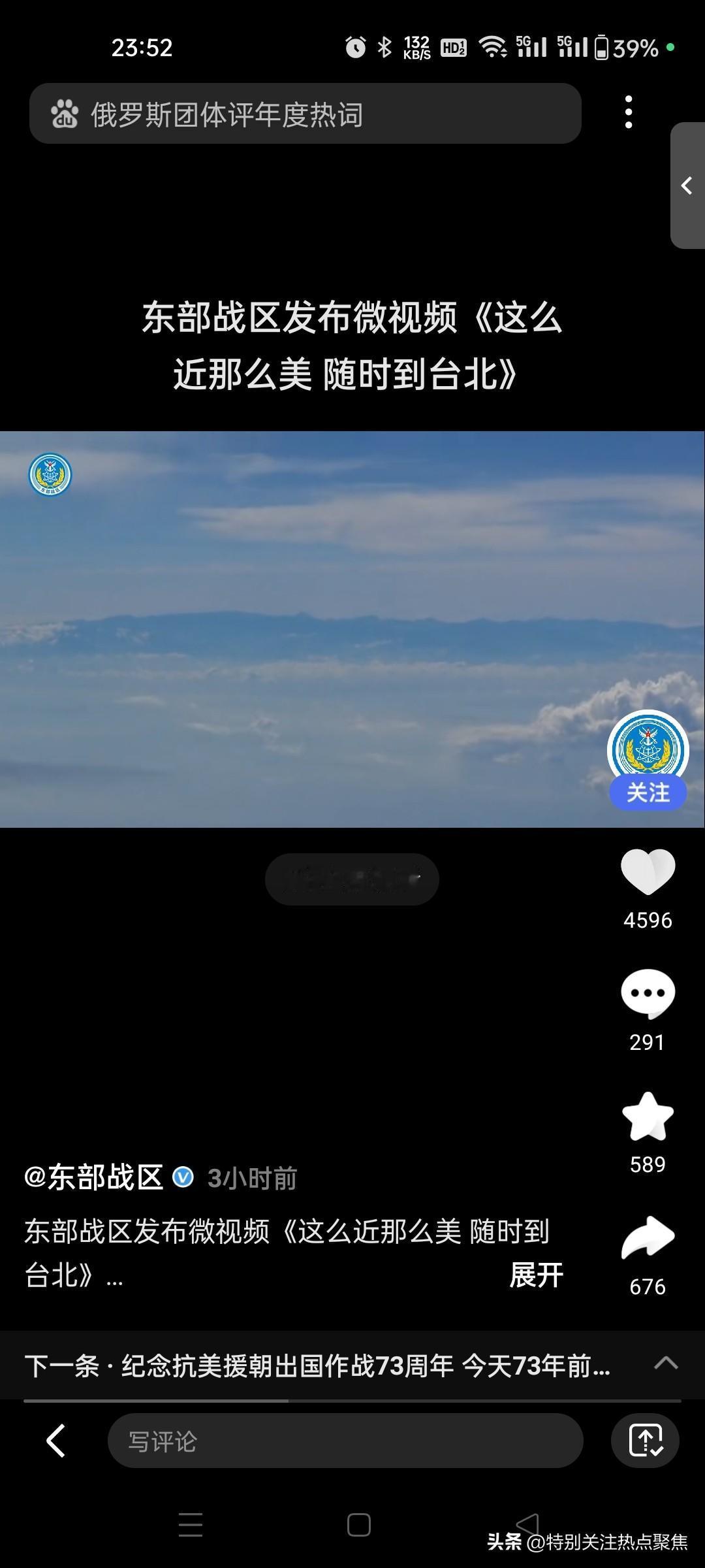 “这么近那么美 随时到台北”,视频中有一句很打动人心的文案:“你就在我的舷窗下,你就在我的舰艏前。伸手可掬起日月潭水,迈步可登上阿里山顶。” 你好!这是东部战区在2025年12月29日发布的一则微视频,主题是“这么近那么美 随时到台北”,通过诗意画面和文字传递了维护国家统一的坚定立场。 视频中有一句很打动人心的文案:“你就在我的舷窗下,你就在我的舰艏前。伸手可掬起日月潭水,迈步可登上阿里山顶。” 它用这种贴近的视角,生动展现了台湾与大陆之间不可分割的地理与情感联系。 发布当天,东部战区还组织了海空兵力在台岛周边进行战备警巡,进一步强化了视频的宣示意义。 如果你对视频内容或相关军事行动有更具体的兴趣,我很乐意继续为你提供信息。 想深入了解视频中的军事行动细节吗?《环台警巡行动全解析》帮你快速掌握演习背景与战略意图。