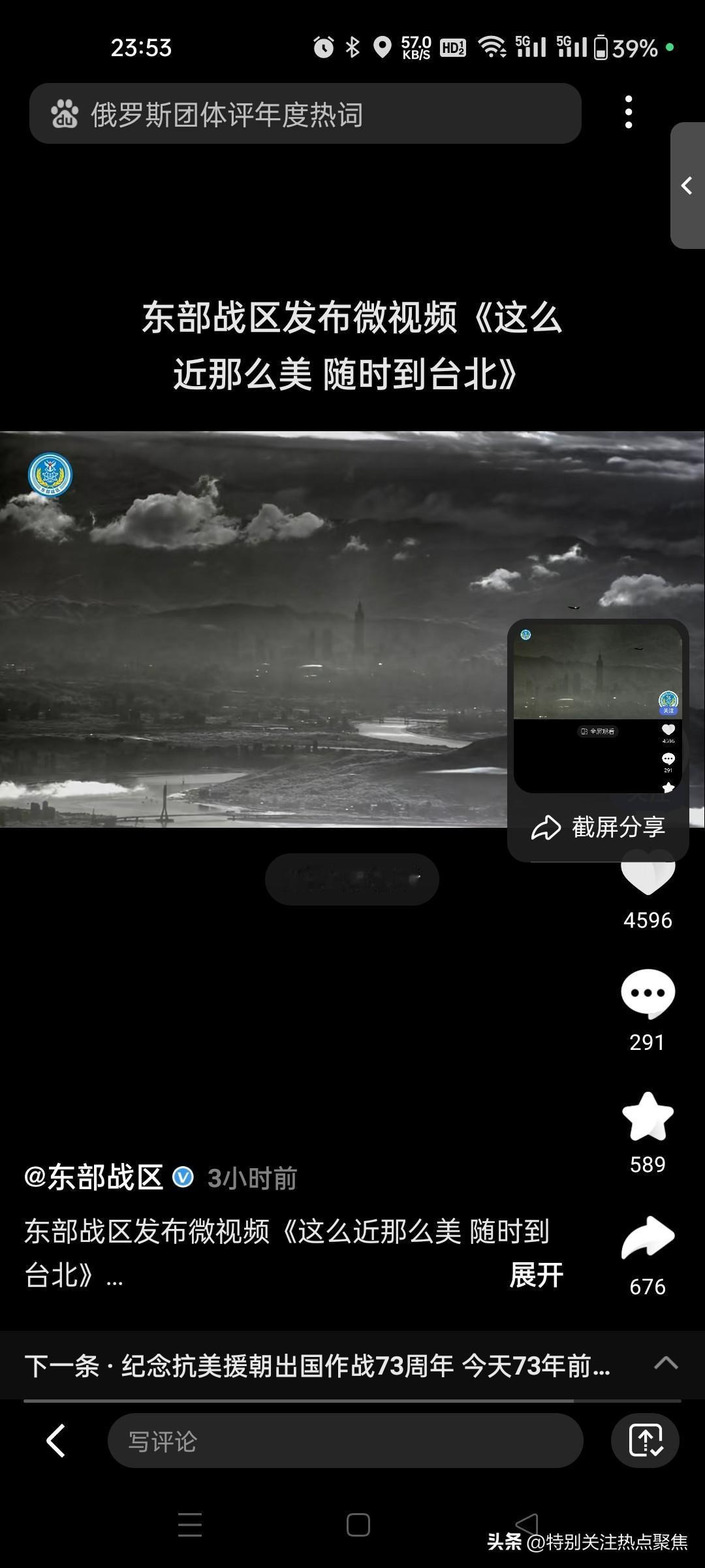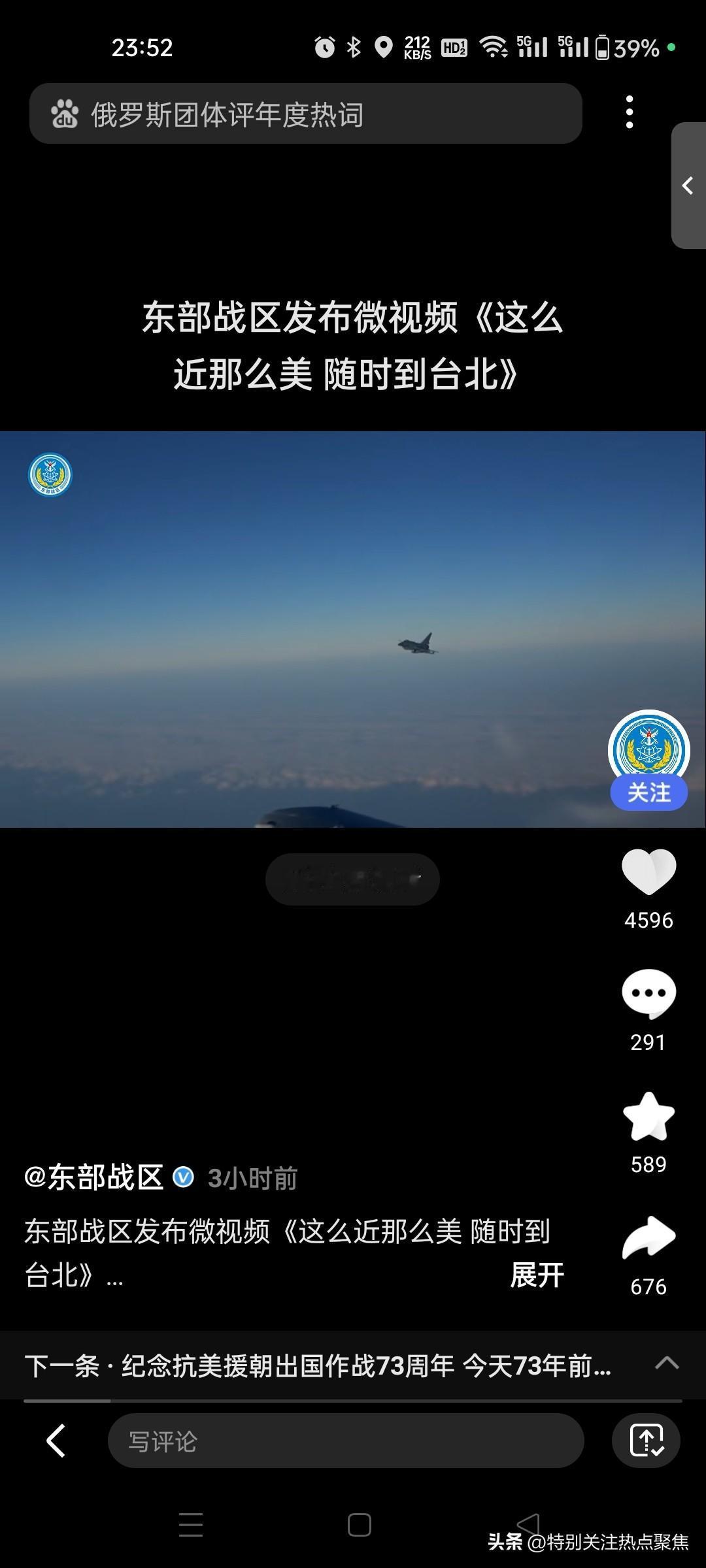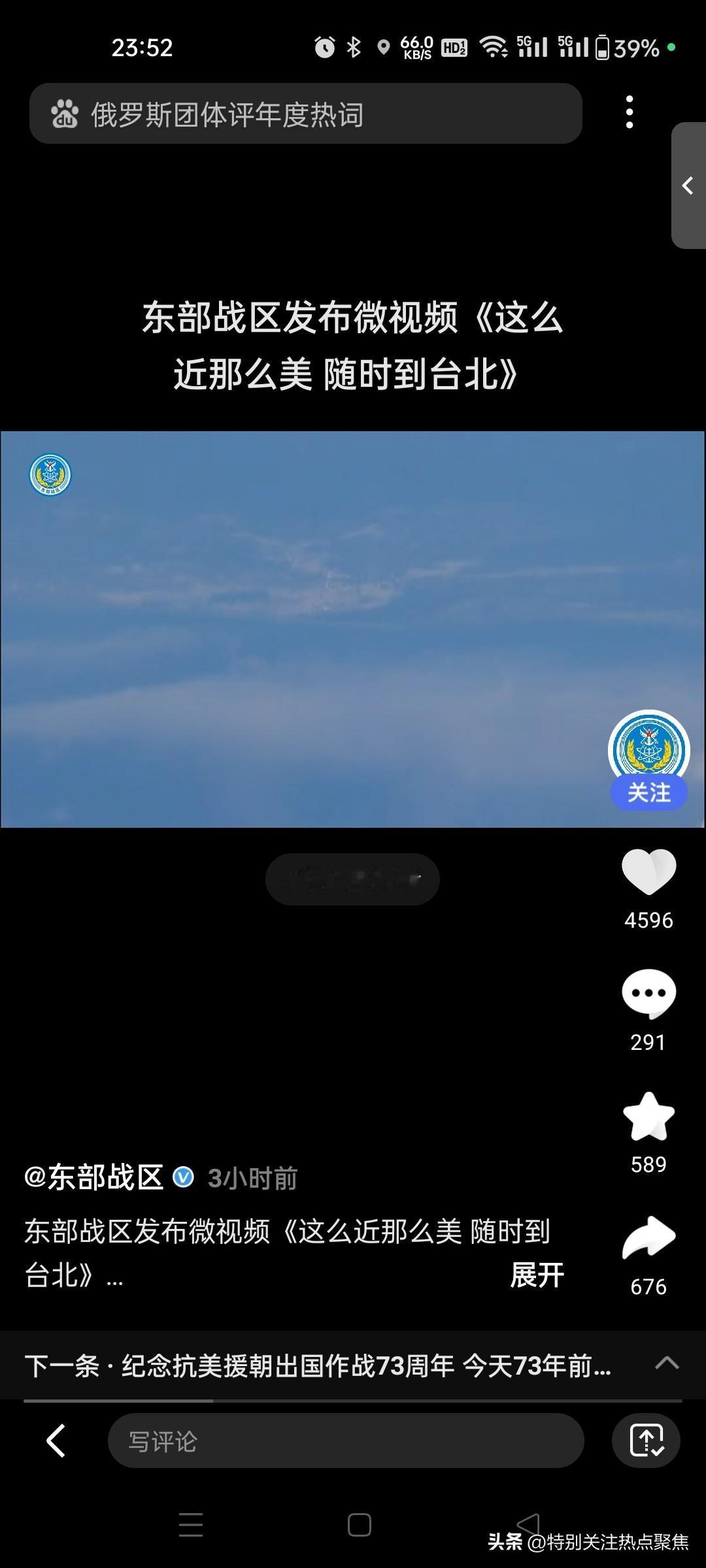 “这么近那么美 随时到台北”,视频中有一句很打动人心的文案:“你就在我的舷窗下,你就在我的舰艏前。伸手可掬起日月潭水,迈步可登上阿里山顶。” 你好!这是东部战区在2025年12月29日发布的一则微视频,主题是“这么近那么美 随时到台北”,通过诗意画面和文字传递了维护国家统一的坚定立场。 视频中有一句很打动人心的文案:“你就在我的舷窗下,你就在我的舰艏前。伸手可掬起日月潭水,迈步可登上阿里山顶。” 它用这种贴近的视角,生动展现了台湾与大陆之间不可分割的地理与情感联系。 发布当天,东部战区还组织了海空兵力在台岛周边进行战备警巡,进一步强化了视频的宣示意义。 如果你对视频内容或相关军事行动有更具体的兴趣,我很乐意继续为你提供信息。 想深入了解视频中的军事行动细节吗?《环台警巡行动全解析》帮你快速掌握演习背景与战略意图。
