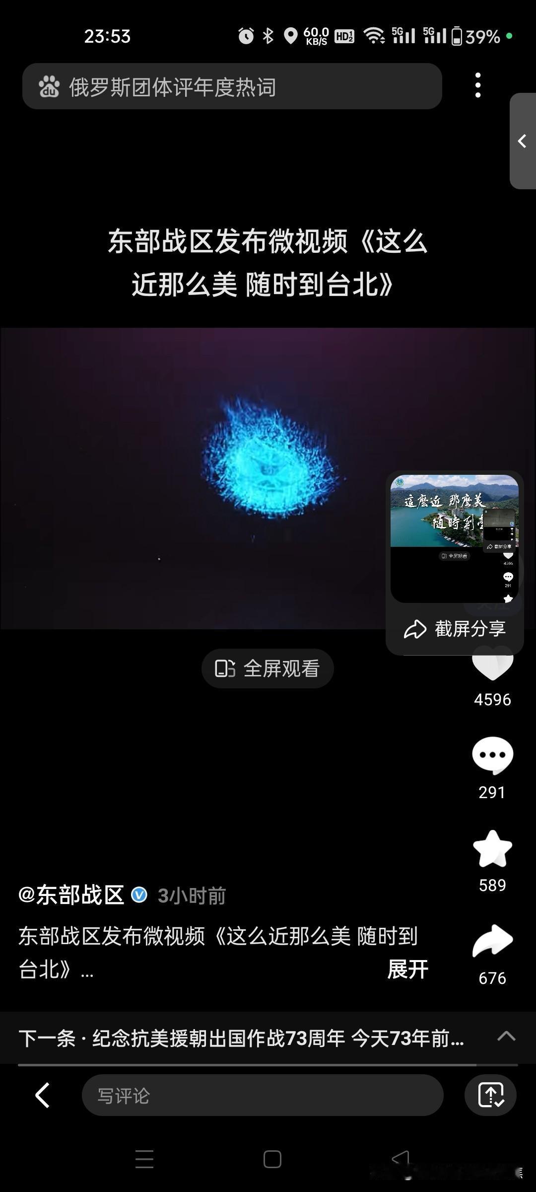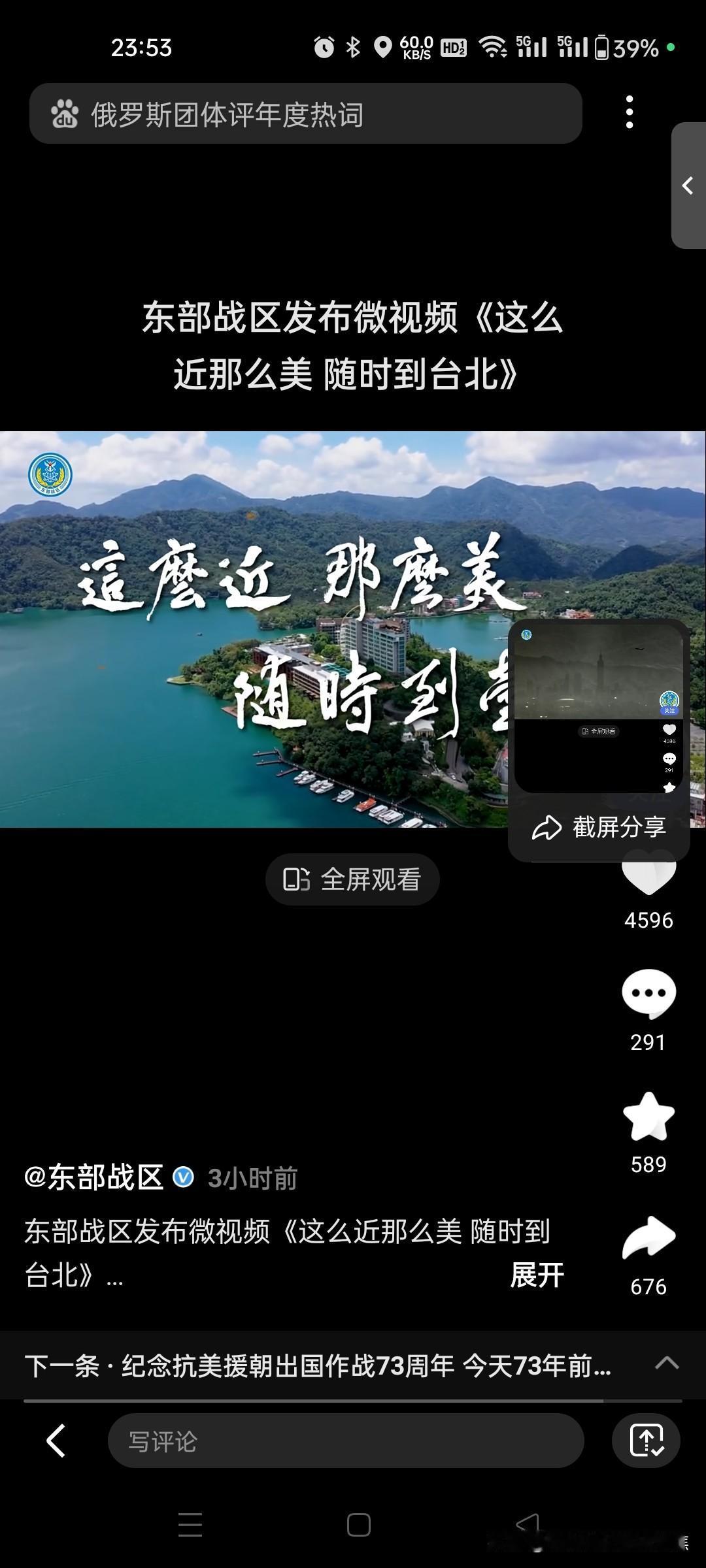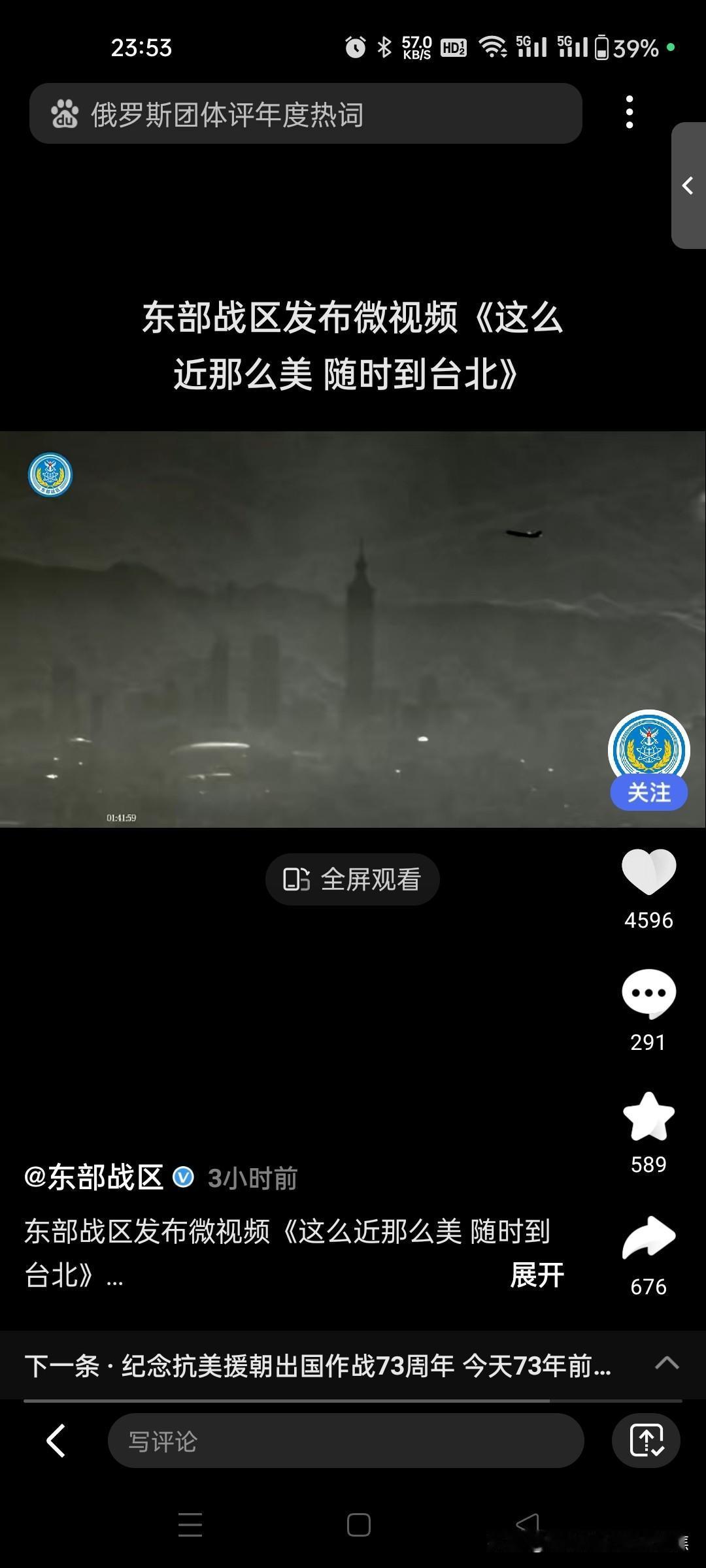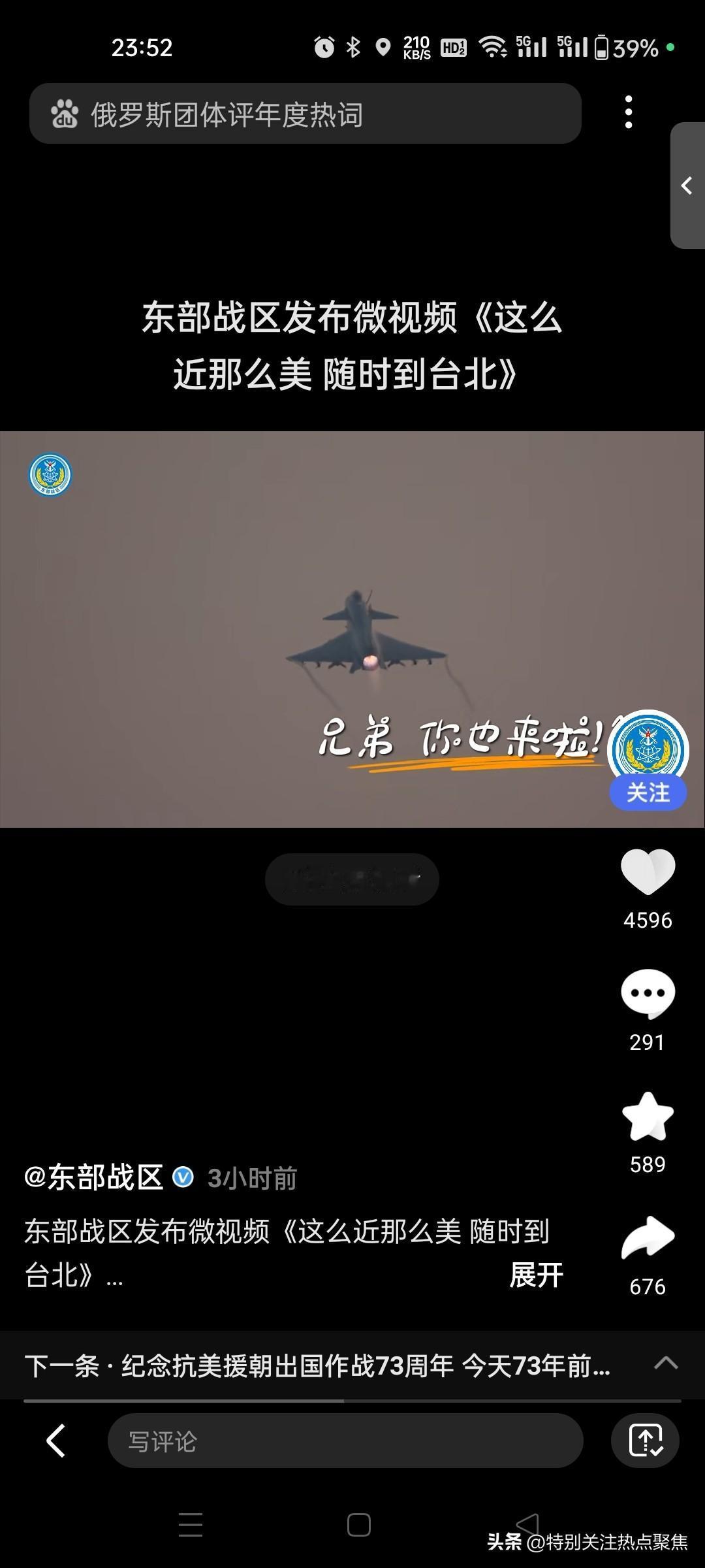 “这么近那么美 随时到台北”,视频中有一句很打动人心的文案:“你就在我的舷窗下,你就在我的舰艏前。伸手可掬起日月潭水,迈步可登上阿里山顶。” 你好!这是东部战区在2025年12月29日发布的一则微视频,主题是“这么近那么美 随时到台北”,通过诗意画面和文字传递了维护国家统一的坚定立场。 视频中有一句很打动人心的文案:“你就在我的舷窗下,你就在我的舰艏前。伸手可掬起日月潭水,迈步可登上阿里山顶。” 它用这种贴近的视角,生动展现了台湾与大陆之间不可分割的地理与情感联系。 发布当天,东部战区还组织了海空兵力在台岛周边进行战备警巡,进一步强化了视频的宣示意义。 如果你对视频内容或相关军事行动有更具体的兴趣,我很乐意继续为你提供信息。 想深入了解视频中的军事行动细节吗?《环台警巡行动全解析》帮你快速掌握演习背景与战略意图。