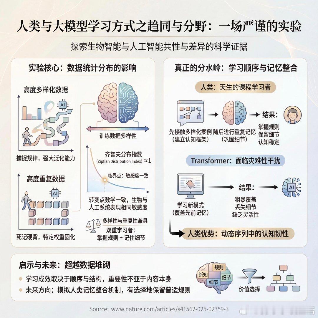 《Shared sensitivity to data distribution during learning in humans and transformer networks》人类与大模型的学习方式是否在本质上趋同?这不再仅仅是一个哲学命题,而是一场严谨的实验。研究者通过对530名人类受试者与小型Transformer网络进行相同的规则学习测试,揭示了生物智能与人工智能之间令人惊叹的共性与分野。实验的核心变量是训练数据的统计分布。当数据高度多样化时,人类和Transformer都能敏锐地捕捉到潜在规律,展现出强大的泛化能力,即在陌生情境下运用规则。而当数据高度重复时,两者都会转向死记硬背,将特定的例子刻进权重。这种行为的转变点在数学上高度一致。在齐普夫分布指数约为1的临界点,生物系统与人工系统表现出了几乎相同的敏感度。只有当数据分布兼具多样性与重复性时,两者才能进化为双重学习者,既掌握规则又记住细节。然而,真正的分水岭出现在学习的顺序上。人类是天生的课程学习者。如果我们先接触多样化的案例建立认知框架,随后再进行重复记忆,我们不仅能掌握规则,还不会丢失细节。相比之下,Transformer却面临灾难性干扰:新学到的模式往往会粗暴地覆盖掉先前的记忆。这意味着,学习的成效不仅取决于你学了什么,更取决于你以什么样的顺序去学。数据结构的重要性丝毫不亚于数据内容本身。人类的优势在于那种能在动态序列中保持认知稳定的韧性,而这正是目前AI所缺失的灵活性。深度学习的未来或许不在于堆砌更多的数据,而在于模拟人类的记忆整合机制。真正的智能不仅是记住一切,更是学会在摄取新知的同时,有选择地保留那些具有普适价值的规则。www.nature.com/articles/s41562-025-02359-3