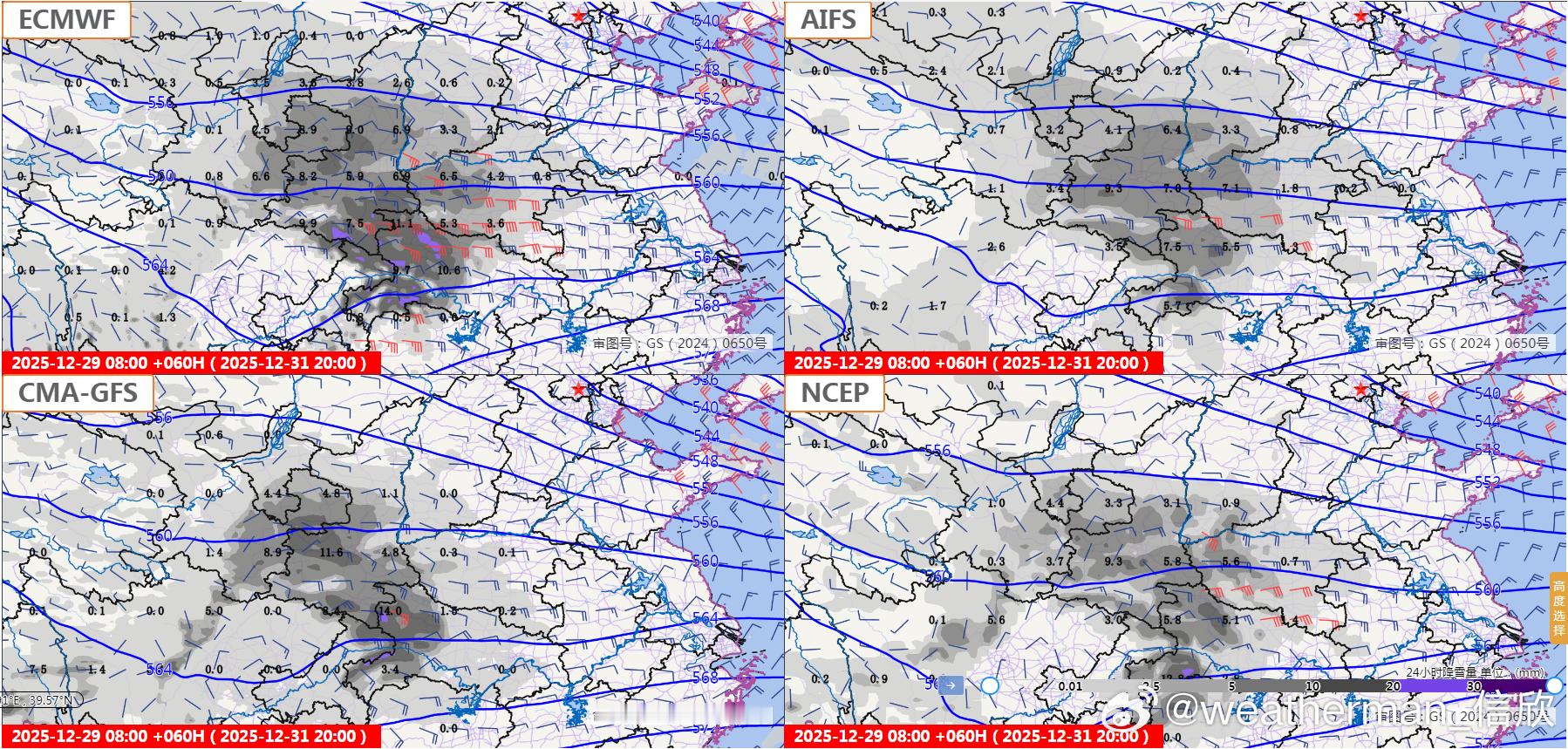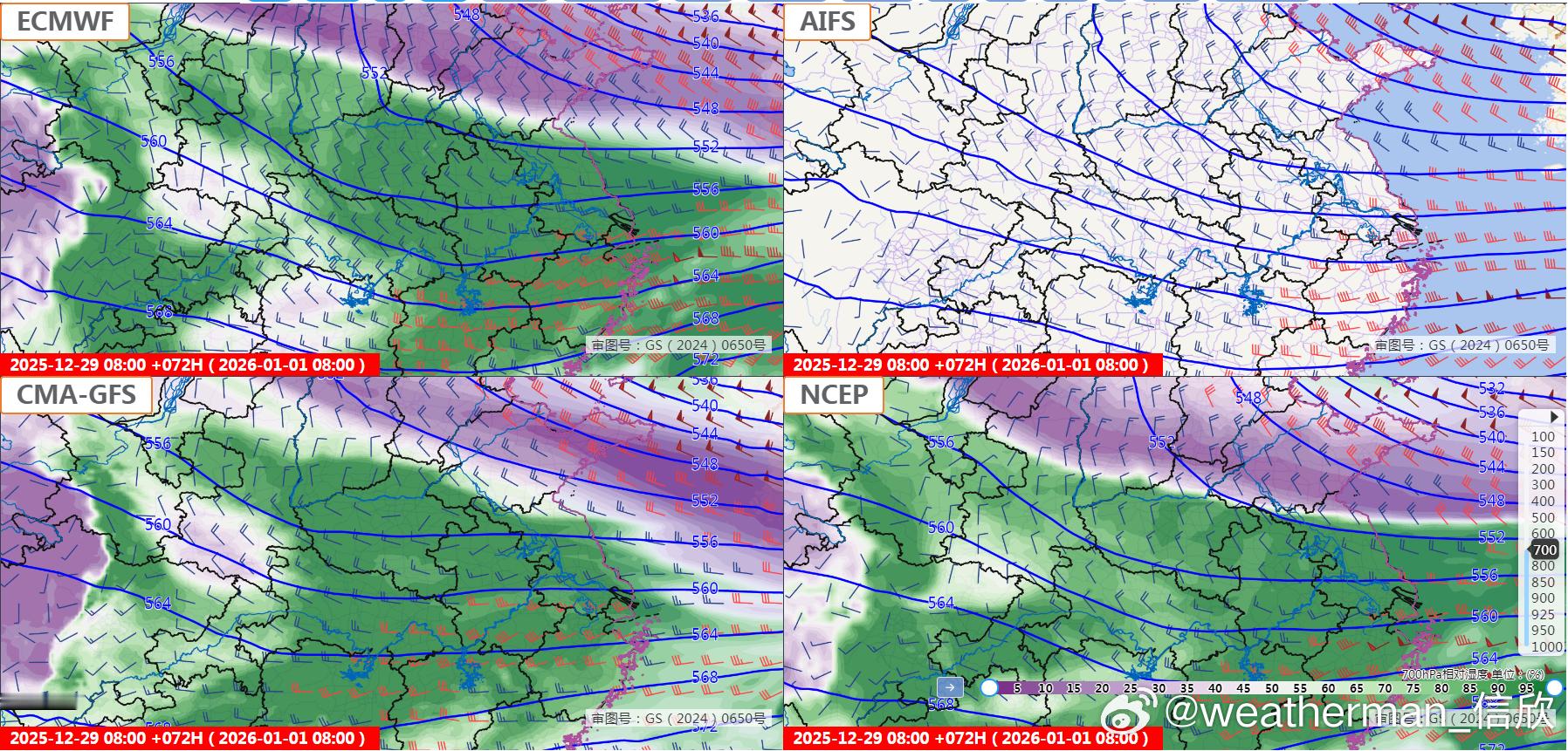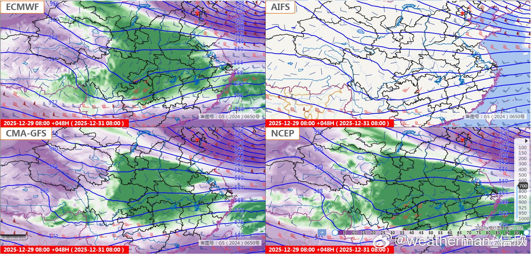 【雨雪发展】相比今天,明天西南多地雨雪会明显增多。之后降水会向东蔓延,加上低空冷空气导致降温,使得部分地区会出现降雪。这次降雪的范围、强度,预报还是相对复杂,数值预报在临近时段,依然存在分歧。西安31日雨转雪,没悬念,但强度还是不好把握。郑州31日大概率有雪。合肥和南京31日晚-1日晨,有机会不保证能下,温度下来时,水汽还能不能有,存疑。杭州看似目前报在降雨区,但1日晨水汽还有,温度也下来,其实下雪的机会不小。图4-6为30日20时-31日20时,官方报的雨雪和数值预报降雪、形势场对比。图7-9为31日20时-1日20时的对比。这次预报,我国CMA-GFS模式报的似乎比欧洲ECMWF模式的合理性更强一些。南支槽不是很强,水汽北界和东界,应该向南收一些。欧洲数值过往经常在槽不是很强的情况下,把低空偏南风和水汽输送的北端,报的过于偏北。因此这次银川-太原一线,可能吃不到水汽。今晚预报,也是把两个城市调出了雪区。而甘肃东部、陕西中南部、河南西部、湖北西北部可能是这次降雪最强区域。