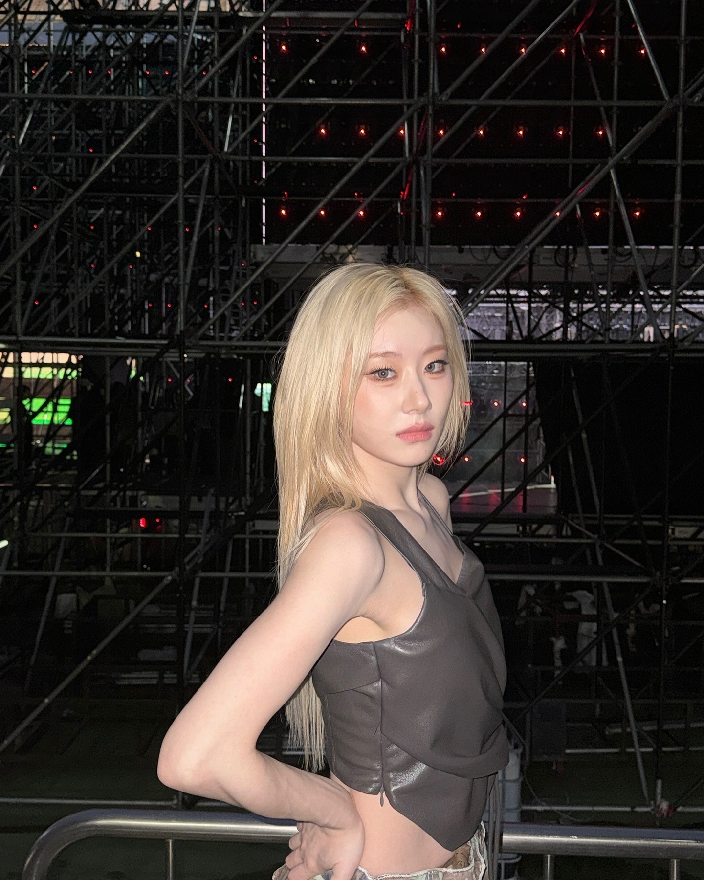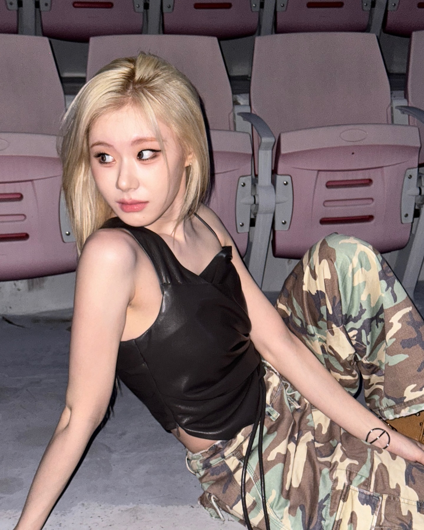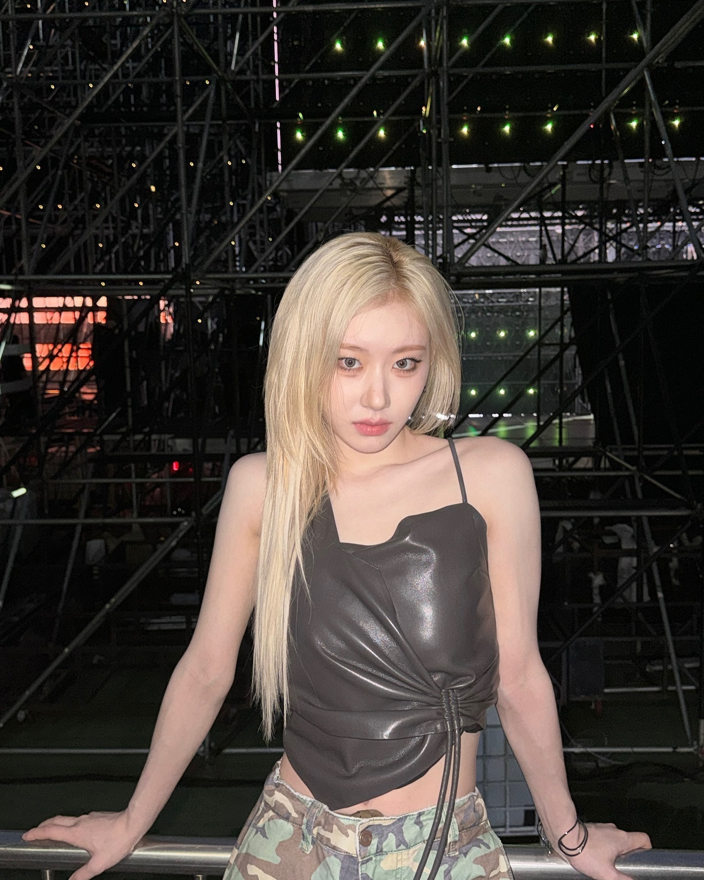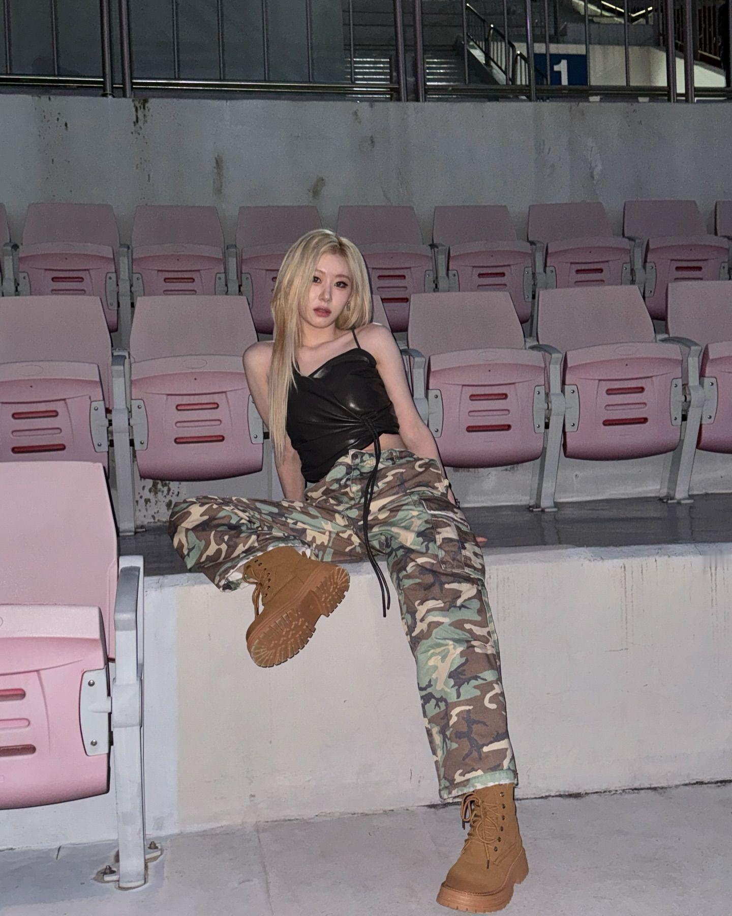 李彩领:金发抹胸迷彩裤穿搭,好酷美的欧尼。李彩领