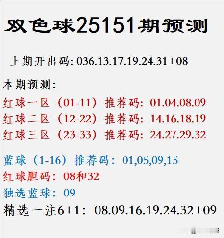 双色球第25151期:天机星图彩运新章 上期开奖星宿归位:03 06 13 17 19 24 31 + 08 本期玄珠在握,试看云开月明—— 红球三区点睛 一区(01-11):灵珠初现,可关注 01、04、08、09 二区(12-22):气运流转,宜留意 14、16、18、19 三区(23-33):天时将至,多聚焦 24、27、29、32 蓝球四象指引 青龙白虎,各显神通:01、05、09、15 本期心水 红胆双曜:08、32 蓝球独魄:09 精铸一注 08 09 16 19 24 32 + 09 祝大家好运,理性购彩,量力而行。