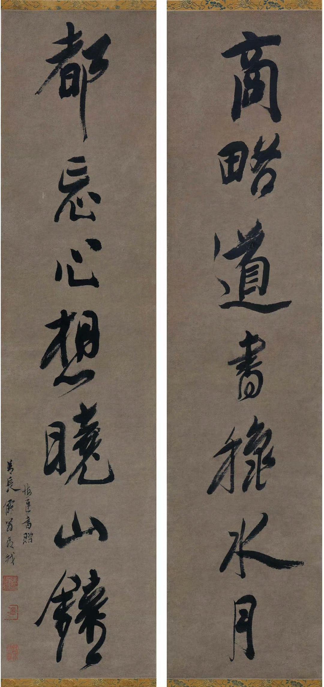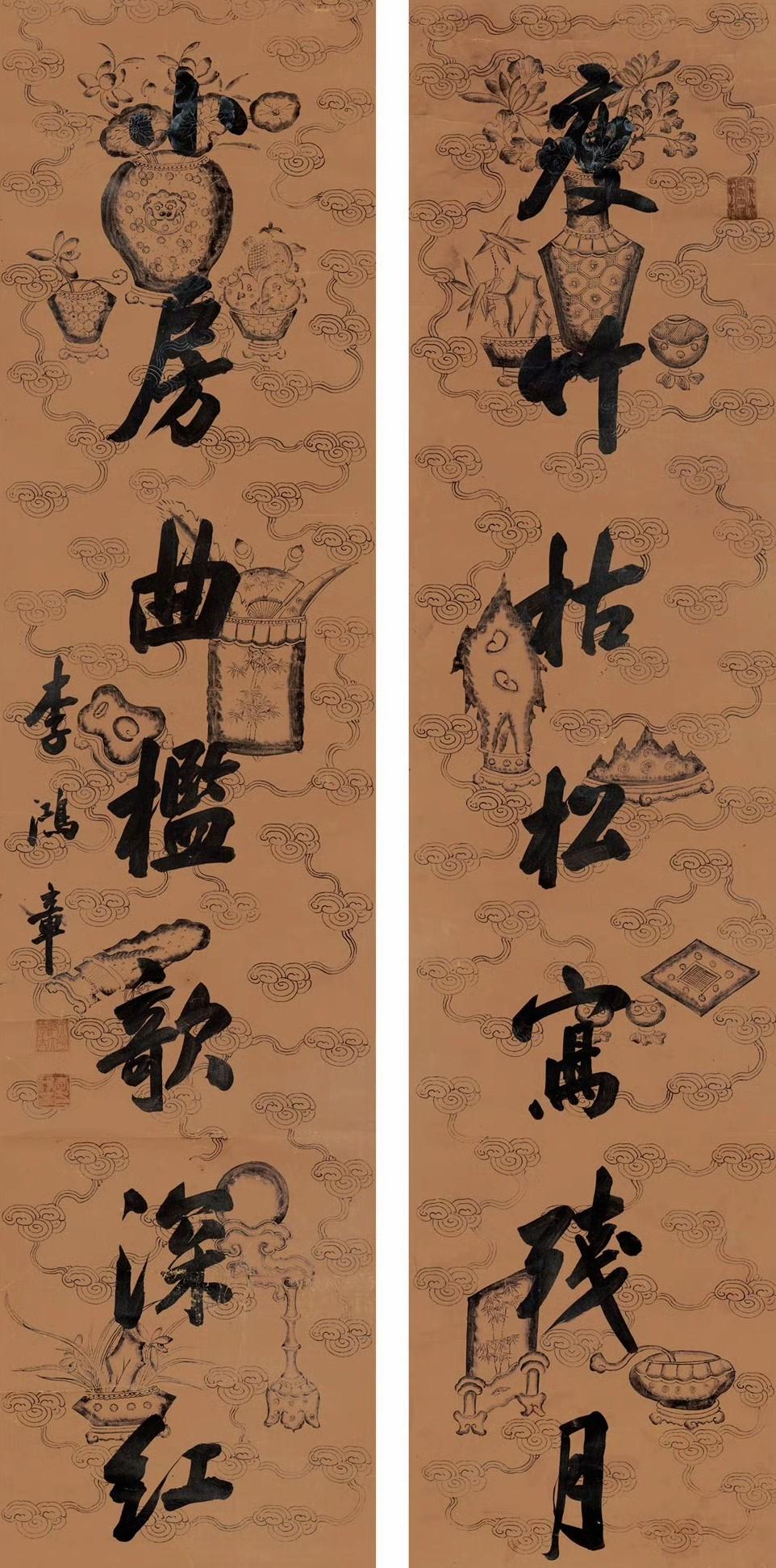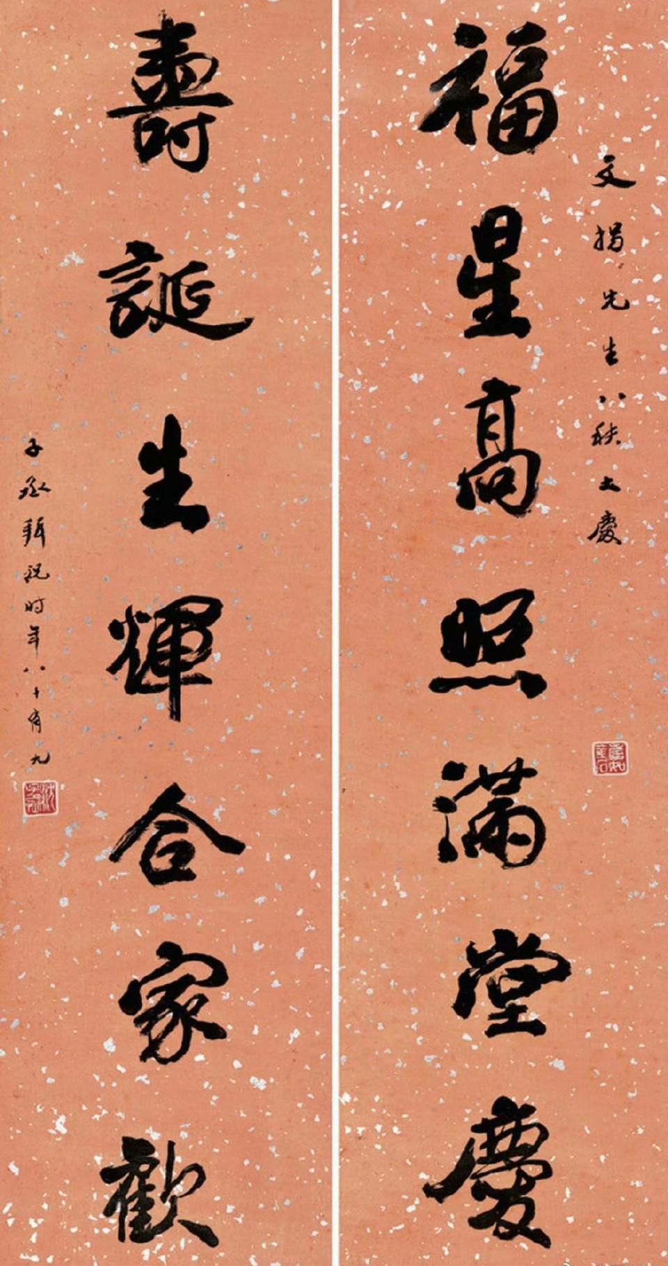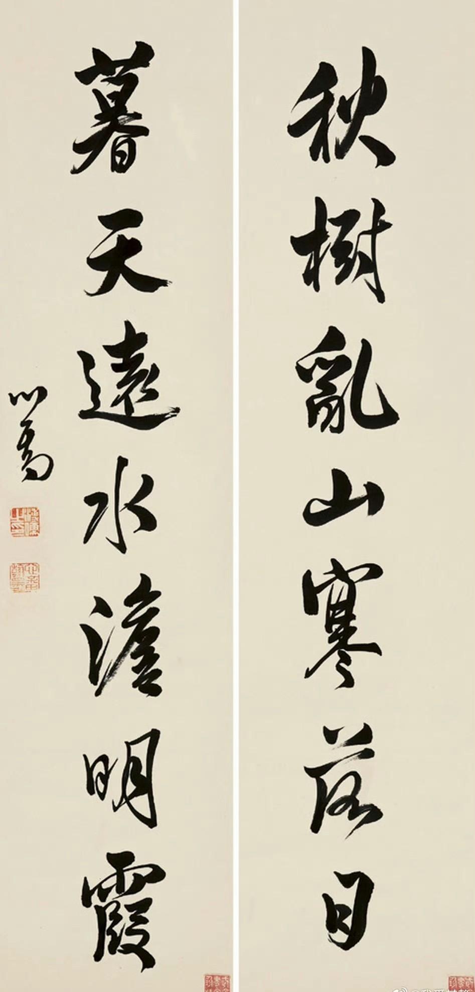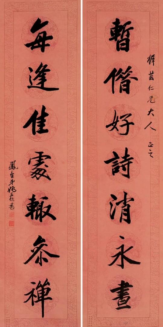 梁同书 行书七言联 《萧散正如君子性,颉颃兼得古人风。 》 吴湖帆 行书七言联 《齐梁格律钟镛振,汲郑心期海岳开。》 永瑆 楷书七言联 《一室图书自清洁,百家文史足风流。》 沈子丞 行书七言对联 《福星高照满堂庆,寿诞生辉合家欢。》 姚孟起 行书七言联 《暂借好诗消永昼,每逢佳处趣参禅。》 王福庵 隶书七言联 溥儒 行书七言对联 《秋树乱山寒落日,暮天远水澹明霞。》 陈洪绶行书七言联 《商略道书秋水月,都忘心想晓山鈡。》 李鸿章 行书七言联 《瘦竹枯松写残月,小房曲槛歌深红。》