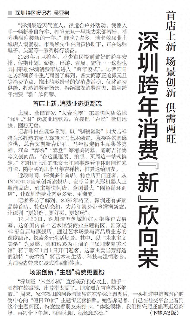记者采访了解到,2026年将至,深圳还有多家品牌首店、特色店亮相,为跨年消费带来满满新意,让深圳“更好逛、更好买、更好玩”。