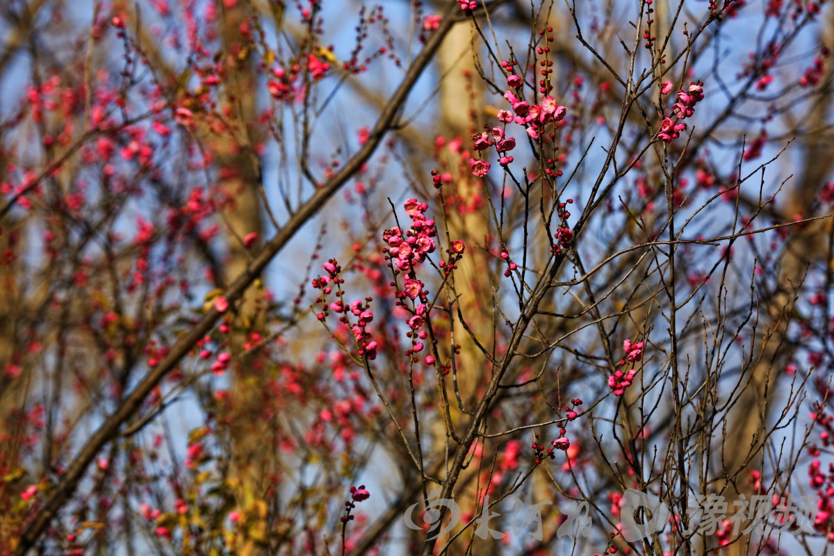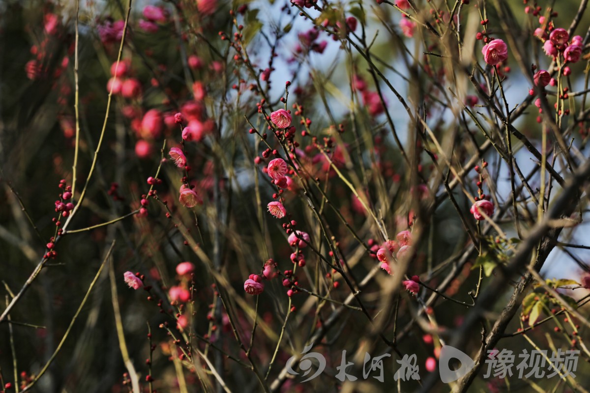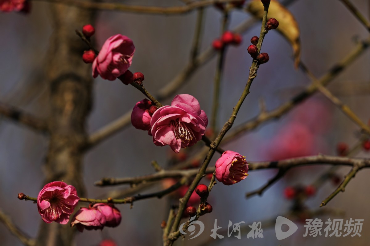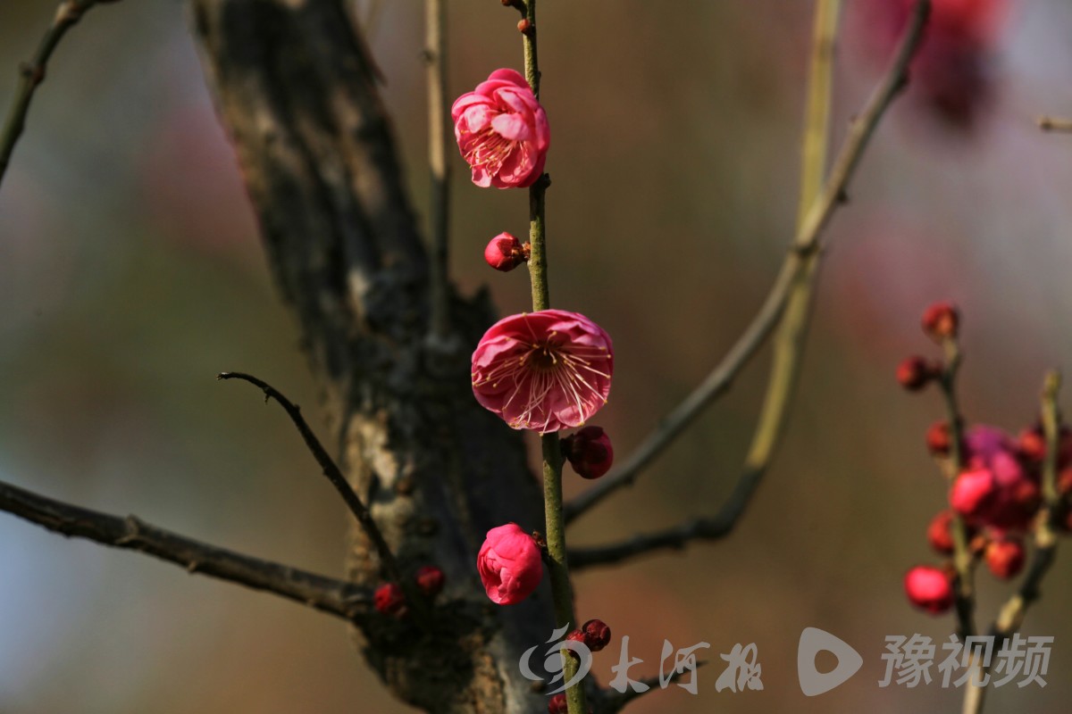 12月30日上午,大河报·豫视频记者沿沙颍河大庆路桥南岸的周口滨河公园向东,步行大约500米就看到眼前有一片绯红的梅花。与周边萧瑟的植被相比,只有在寒冬时节才绽放的梅花显得格外娇艳。花瓣绯红、花蕊泛黄,伴着冬日的微风,花枝摇曳、暗香浮动,美得沁人心脾,令人流连忘返。