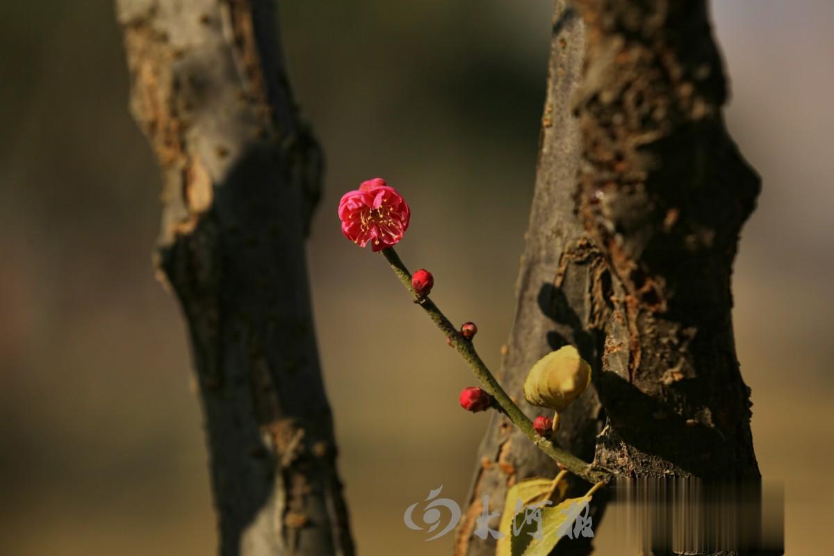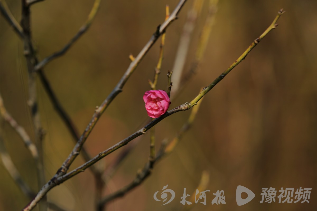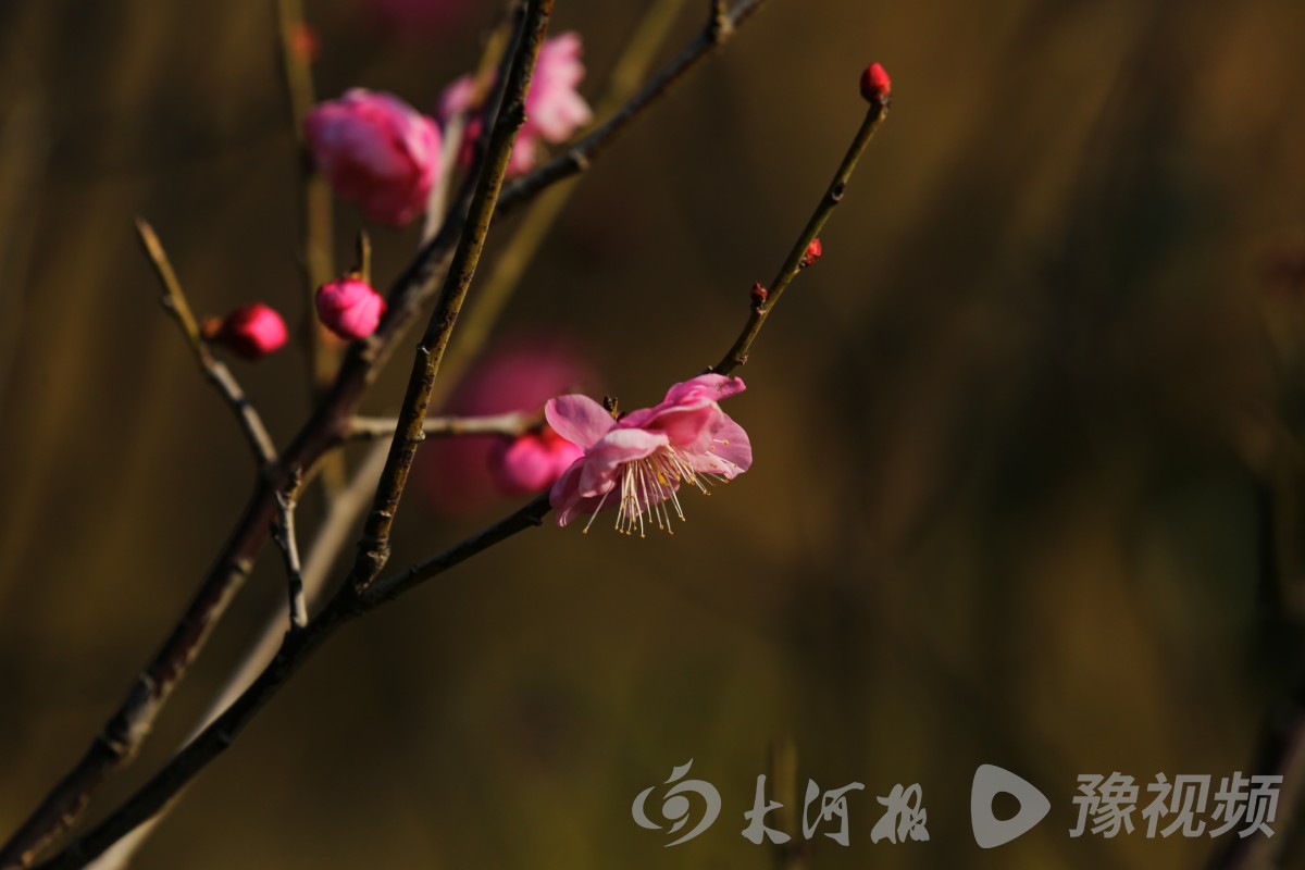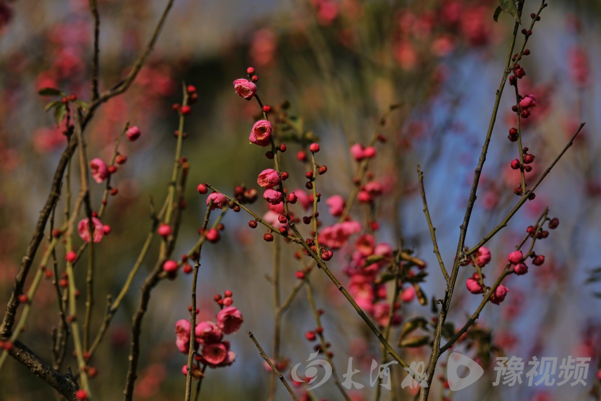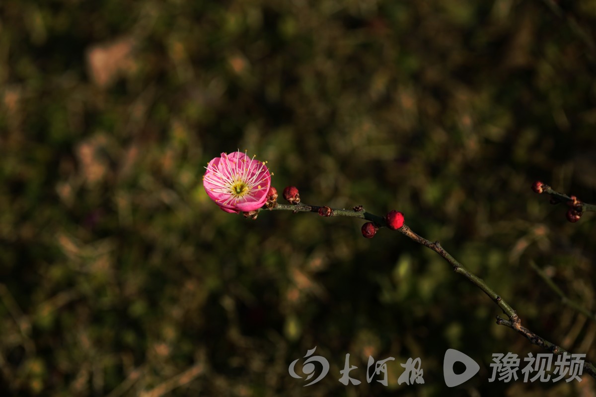 12月30日上午,大河报·豫视频记者沿沙颍河大庆路桥南岸的周口滨河公园向东,步行大约500米就看到眼前有一片绯红的梅花。与周边萧瑟的植被相比,只有在寒冬时节才绽放的梅花显得格外娇艳。花瓣绯红、花蕊泛黄,伴着冬日的微风,花枝摇曳、暗香浮动,美得沁人心脾,令人流连忘返。