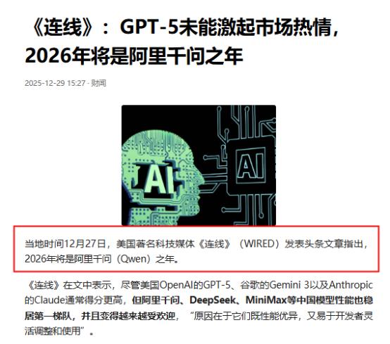 熟悉的一幕再次上演,西方媒体拍手叫好的对象,又是中国! 近期,美国著名科技媒体《连线》发布了一篇头版文章,在当中毫不客气的指出,美国的GPT-5未能激发市场热情,而反观中国的阿里千问性能表现优异,部署应用能力极强,2026年将属于千问。   要搞明白《连线》为啥敢这么给阿里千问站台,先得看看美国AI圈的标杆GPT-5是怎么掉链子的。   之前OpenAI的CEO萨姆·奥特曼带着GPT-5亮相的时候,那可是把调子定得老高,说这款模型能让自己都觉得“没用”,号称是通向通用人工智能的关键一步,整个科技圈一开始也确实沸腾了一把。   可热闹劲儿没过多久,现实就给了市场一记耳光,所谓的“革命性突破”压根没出现,早期测试用户用下来,普遍觉得GPT-5比起前代模型没什么质的飞跃,有科技媒体记者直接吐槽更新“大多无聊”。   更尴尬的是,不少GPT-4o的老用户还觉得体验倒退了,闹着要换回旧模型,逼得OpenAI没办法,只能紧急重新启用付费用户的模型选择器。   这种“新不如旧”的反差,直接让期待颠覆性升级的市场凉了心,原本的热度瞬间变成了失望。   GPT-5的拉胯还不只是用户体验的问题,背后更是OpenAI的战略混乱和创新乏力。为了挽救口碑,他们很快又推出了GPT-5.2,宣称要做瞄准白领职场需求的“高效执行者”,说能从辅助聊天转向独立扛活,结果这定位更像是慌不择路的应激反应。   真正的职场核心需求,比如法律文书撰写、财务分析、科研辅助这些复杂任务,GPT-5.2根本扛不起来,所谓的“碾压前代”全是空洞的口号。   更要命的是,面对谷歌Gemini 3的竞争压力,OpenAI还启动了最高级别的“红色警报”,让全员都去修补ChatGPT的日常体验,把广告、AI代理这些创新项目全停了,典型的拆东墙补西墙。   这种混乱的状态,再加上OpenAI正筹备IPO却拿不出能撑得起万亿估值的过硬产品,不仅让用户失望,连投资者都开始怀疑他们的商业化能力,GPT-5没能成为救命稻草,反而成了美国AI巨头技术傲慢和市场脱节的注脚。   就在美国AI圈陷入这种慌乱的时候,中国的阿里千问却交出了完全不一样的答卷,这也是《连线》愿意为中国AI叫好的核心原因。   首先得说性能,阿里千问可不是靠吹出来的,在全球权威的基准测试里实打实拿了好成绩,比如编程任务的HumanEval得分达到89.7,超过了GPT-4o的87.5,数学任务的GSM8K准确率也接近95.3%,跟顶尖的Claude-3.5-Sonnet差不了多少。   更关键的是,千问还搞了个很实用的创新,就是“思考模式”和“非思考模式”能动态切换,复杂任务就慢慢推演保证精准,简单对话就快速响应节省算力,打破了传统大模型一刀切的算力浪费问题。   而且它的参数效率也高得离谱,小规模的模型性能就能超越前代的大参数模型,企业部署的成本直接降低了80%以上,这对需要实际落地的企业来说,吸引力可比只讲概念的GPT-5大多了。   比起性能优异,阿里千问的部署应用能力强才是真正打动市场的关键,这也是《连线》强调“2026年将属于千问”的核心依据。《连线》自己也说,衡量AI模型价值的关键,不只是看它多聪明,更要看被用来构建其他应用的广度,而千问在这方面简直是降维打击。   它走的是全面开源的路子,这就让全球的开发者都能灵活调整使用,全球最大的AI开源社区HuggingFace数据显示,2025年7月中国开源模型的下载量就超过了美国,阿里千问稳居第一,在海外的API调用量也冲到了全球第四。   更重要的是,千问已经不是停留在实验室里的模型,而是真真切切用到了各行各业,比如2025年春晚的“子弹时间”特效就是它驱动的,实现了360度环绕视角的实时渲染,还有和企业合作推出的矿山风险识别系统,在陕煤的煤矿里落地使用,第一次让大模型在采矿这种传统行业规模化应用。   从春晚的黑科技到矿山的安全生产,千问的部署场景覆盖了从端侧到云端的全需求,这种能落地、能创造实际价值的能力,正是当下AI行业最需要的,也难怪西方媒体会忍不住叫好。   其实西方媒体这次为中国AI拍手叫好,并不是什么突然的转变,更不是刻意捧杀,而是基于全球AI产业发展的现实判断。之前很长一段时间,西方舆论总觉得AI的话语权在硅谷手里,可这次GPT-5的失败和阿里千问的崛起,彻底打破了这种偏见。   阿里千问的成功,本质上是踩准了行业发展的节奏,把性能、效率和实用性做到了平衡,而GPT-5的失败,恰恰是因为沉迷于AGI的空想,脱离了市场的实际需求。   《连线》作为美国主流科技媒体,选择客观站出来肯定中国AI的成就,说到底也是遵循了产业发展的客观规律,毕竟在技术面前,好不好用、能不能落地,才是最硬的道理。