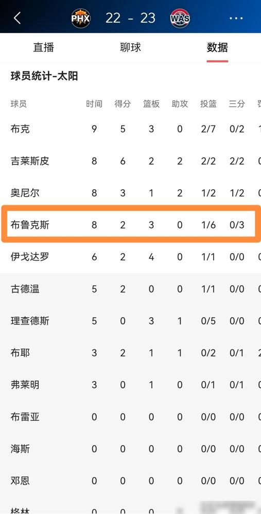 太阳恶汉狄龙-布鲁克斯真是太不自量力了!在今天太阳客场挑战奇才的比赛中,目前双方的第一节比赛已经结束,太阳以22:23落后于对手。 刚看完首节战报,我真的想吐槽一下。狄龙这首发打得,真是让人看得很窝火。 他在这短短 8 分钟里,硬是抢了 6 次出手。结果呢?投篮 6 中 1,甚至三分球 3 投 0 中,忙活半天只蹭到 2 分,正负值更是直接来到了 -2。 我最在意的是这种出手的频率。8 分钟投 6 次,这在首发阵容里占了多少球权?感觉他完全没把自己当角色球员,反倒像是个拥有无限开火权的核心。 这种“浪投”模式真的很伤士气。手感冰凉不可怕,可怕的是即便怎么投都不进,还要继续强行打。 这种打法不仅是自己数据难看,关键是彻底乱了队友的节奏。看比分就知道,太阳本来是有机会压制对手的,结果硬是被这种低效进攻把势头给压下去了。 我觉得这种所谓的“自信”如果脱离了效率,其实就是对球队的一种伤害。 角色球员的首要任务应该是拉开空间或者防守,而不是在手感极差的时候还固执地占用球权。 照这个趋势打下去,如果他不赶紧调整定位,太阳这场客场比赛恐怕悬念还大着呢。