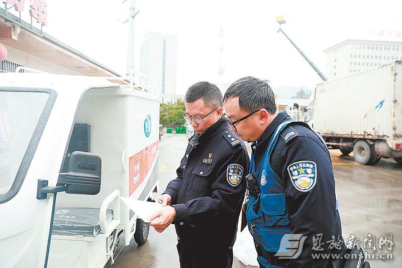12月23日,在恩施市金桂机动车检测站,3名恩施市公安局交通管理大队车驾管中队民辅警仔细查验中通快递公司60辆新购入的快递车。查验之后,这些车辆就可以在服务站实现注册登记。