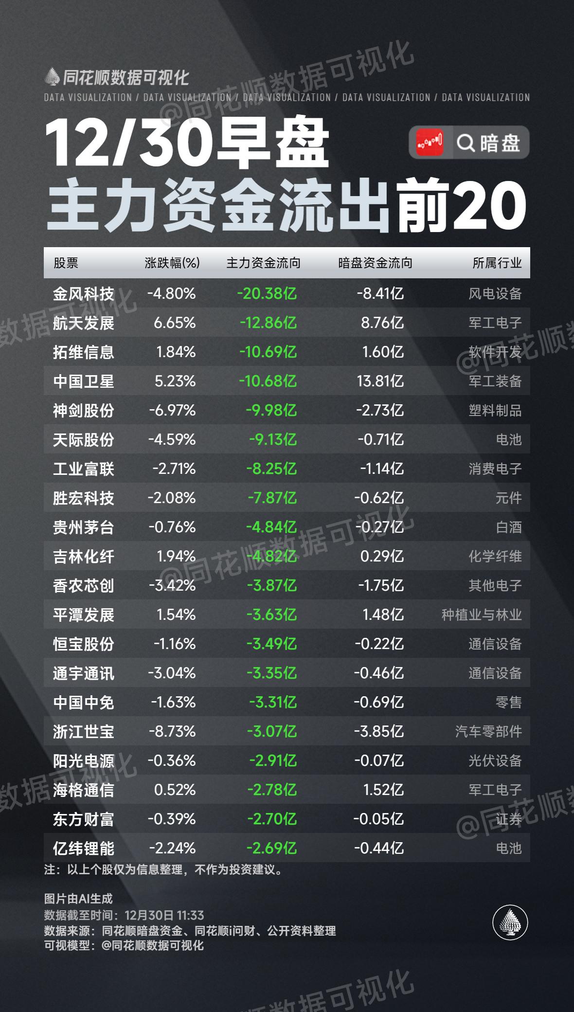 12月30日,周二A股主力资金流入流出一览表!!! 山子高科主力资金大幅买入14.30亿,暗盘资金流入5.71亿,后市值得高看一眼;N强一主力资金大幅流入11.75亿,暗盘资金出逃8.23亿,后市注意风险;金风科技主力资金大幅流出超20亿,后市需小心谨慎操作!!!