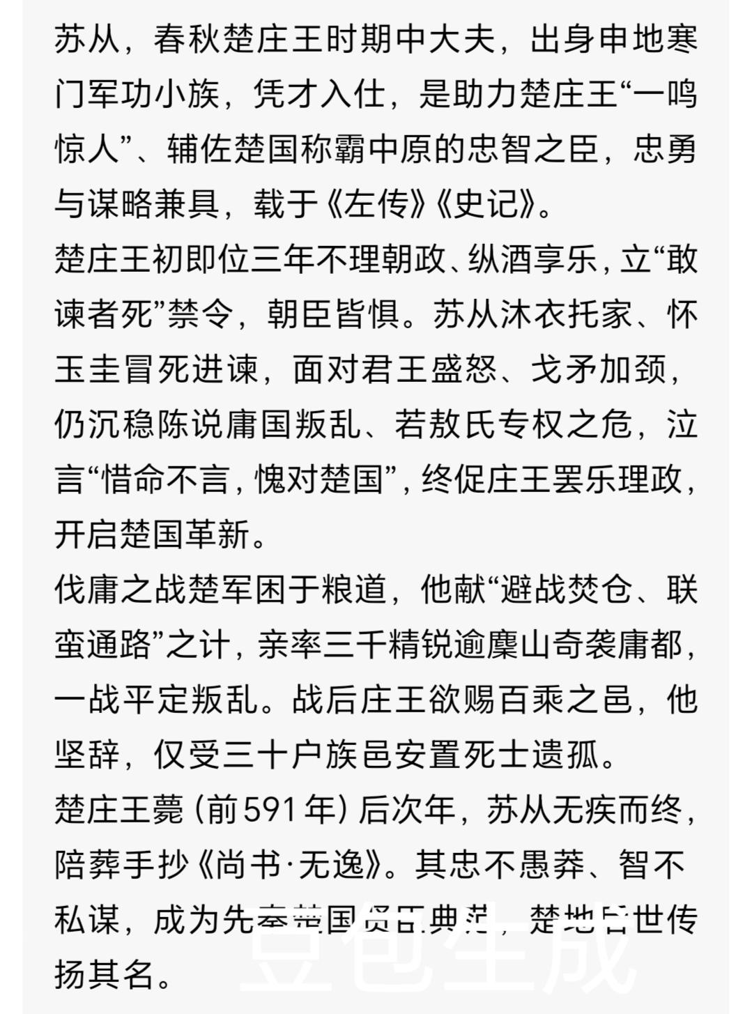 周朝时期楚庄王之臣(苏从)的一生 剑架在脖子上时,他反而挺直了脊梁:“若以臣之死能换君王醒悟,臣甘愿血溅丹墀(chí)!” 公元前611年,郢(yǐng)都王宫深处编钟声终日不绝。新即位的楚庄王熊旅已连续三个月不理朝政,白天狩猎饮酒,夜晚观赏歌舞,宫门外求见的士大夫们无不叹息,皆忧心楚国要毁在这位君王手里。谁也没料到,改变楚国命运的,竟是出身不算显赫的中大夫苏从。 苏从祖上是申地(今河南南阳北)小宗族,靠军功获封邑。少年时,他在竹简上读到商朝比干谏纣王被剖心的记载,曾问老师:“忠臣明知必死,为何还要进谏?”老师答:“因为有些事比活着更重要。”这句话深植于心,二十岁入郢都为官时,苏从在宗庙前立誓:“此生若见君过而不谏,犹盗楚国社稷。” 楚庄王即位头三年,楚国危机四伏:西北庸国联合群蛮叛乱,南方百越部落蠢蠢欲动,国内若敖(áo)氏贵族把持朝政。可年轻的国君竟挂出告示:“敢谏者,死!”大夫伍举曾迂回进谏:“有鸟三年不飞不鸣,是何鸟也?”庄王笑答:“三年不飞,飞将冲天;三年不鸣,鸣将惊人。”说罢依旧纵酒享乐,朝臣们心凉半截,唯有苏从听出弦外之音——君王非真糊涂,只是在等时机,但楚国早已等不起! 据《左传》记载,苏从进谏前做了三件事:沐浴更衣,吩咐家臣“若午时未归,便送夫人孩子回申地”;揣好刻着“楚国安危,系于今日”的玉圭(guī);佩上青铜剑,不是防身,而是准备自决,以免君王背负“杀直臣”的恶名。 彼时王宫大殿酒气弥漫,楚庄王斜倚玉几,眯眼打量阶下苏从:“你不知寡人的禁令?”“臣知。”苏从声音沉稳,“但臣更知庸国已夺我三邑,若敖氏私兵日增,大王若再沉湎享乐,楚先王基业将毁于一旦。” 青铜盏骤然砸碎,侍卫的戈(gē)矛瞬间抵住苏从后颈,史官握着竹简颤抖记录:“王怒,欲杀之。”生死关头,苏从反倒抬头,不求饶,只逐条陈明楚国危机:庸国地形图、若敖氏粮草储备、百姓怨言,句句铿锵有力。最后他直言:“昔年比干死而商亡,今日大王杀臣,不过添一缕孤魂,明日史书必写——楚庄王杀忠臣而失天下!” 殿内死寂良久,庄王突然挥手屏退侍卫,起身扶起苏从:“大夫真不怕死?”“怕。”苏从眼角泛红,“但更怕子孙指着臣的坟墓骂:‘此人眼见楚国将倾,却因惜命不言!’” 这场进谏成了楚国命运的转折点,楚庄王当夜诏令:罢歌舞,焚猎具,次日临朝理政,史称“一鸣惊人”的革新就此开启。苏从获任司马辅佐朝政,第一件事便是登门向若敖氏家主致歉,只为缓和矛盾、为革新留足时间。同僚不解,他叹道:“治国如烹小鲜,火候急了会焦。” 这份智慧在伐庸之战中尽显。当时楚军粮道被断,军心浮动,苏从提议“不与庸人争一城一地,分兵焚其粮仓”,更带着十车盐帛绕道深入蛮族部落——不以征战,而是交易,用楚国食盐换蛮族向导,用帛布换隘口通行权。三个月后,庸国主力与楚军正面对峙,苏从率三千精锐穿越世人眼中“不可逾越”的麇(jūn)山密林,神兵天降般兵临庸都城下,此战也成春秋迂回突袭的经典战例。 战后论功行赏,庄王欲赐苏从百乘之邑,他坚辞不受:“战乃将士用命,臣不过尽本分。”最终只受扩编族邑三十户,恰好安置战死部属遗孤。 晚年的苏从愈发沉静,有年轻官员问他:“大人当年冒死进谏,凭的是何等信念?”老人摩挲着庄王亲赐、刻有“楚之肝胆”四字的谏玉,缓缓道:“不是信念,是算计。” 众人惊愕之际,他解释:“我算过三种结果:最坏不过一死;中等是被囚,却能警醒朝野;最好便是大王纳谏。楚国能得救的概率,值得用性命去搏这‘最好’。”原来最悲壮的忠贞里,藏着谋士最冷静的权衡,这份“理性的热血”,正是历史最真实的底色。 公元前591年,楚庄王薨(hōng),次年,苏从无疾而终,葬于郢郊。他的陪葬品极简,唯有一卷手抄《尚书·无逸》,其中“君子所其无逸,先知稼穑(sè)之艰难”一句,被反复勾勒。 三百年后,屈原作《天问》写下“比干何逆,而抑沉之”时,楚国故老仍在传诵苏从的故事。这个以性命为筹码的谋士,用极致方式诠释了“士为知己者死”——他的“知己”,从不是某位君王,而是脚下这片名为楚国的土地。 读史至此,不禁想问:若身处苏从之位,你会选择冒死进谏,还是明哲保身? (注:本文主要依据《史记·楚世家》《左传·宣公年间》记载,结合清华简《系年》等考古成果中对楚国政制的考证。人物对话细节参照先秦策论文体例还原,重大事件均有史料对应。)东周列国志 楚庄王之臣