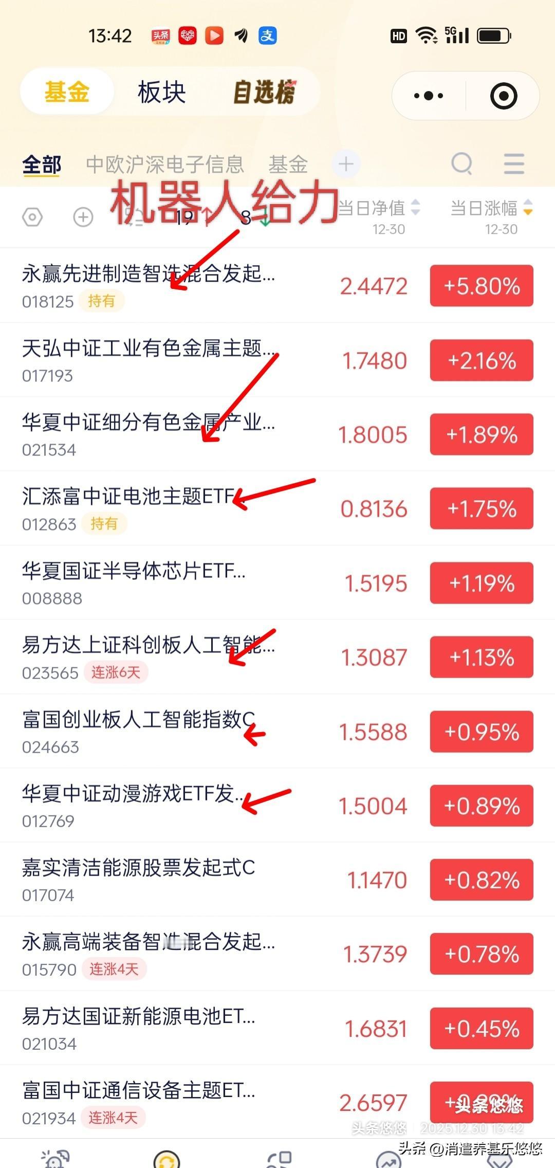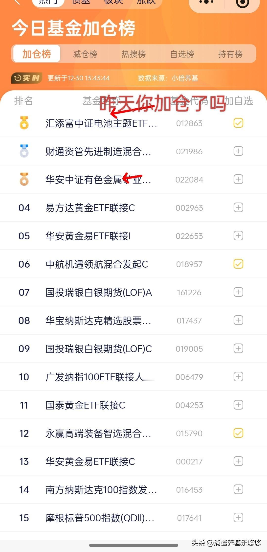 12.30日基金操作观点及加仓榜 节前发不发红包,今天很关键,看早盘走势,大盘不可能大跌,看下午能不能突破昨天的3984高点,否则这个就是短线顶。 怕高不敢追高的人(本人算一个)今年赚钱效应不好,坚守不住热门赛道,一涨就跑的也赚不了多少钱,只能喝点肉汤而已。 恒生科技,老鼠药,科创芯片,有色金属,科创Ai前面文章刚发了具体分析,可以去看看,作为参考。 中证电池,昨天跌幅较大,今天盘中一度大幅下探,主力吓人洗盘嫌疑,目前10日线上穿20-30日线,继续看涨,午后拉升,持仓待涨 人形机器人,预期涨幅还没有实现,昨天追高介入的今天吃肉了,继续持仓待涨。 通信设备与cpo,高位震荡整理,谨慎看多,持仓待涨。 半导体材料设备,今天回踩了10日线支撑,周线趋势向上运行,持仓待涨,轻仓适当低吸。 消费电子,突破了60日线压力,持仓待涨。 .. 动漫游戏,前期整理颈线区域震荡整理,持仓待涨。 金融科技,一个星期前,曾经发文提示在年线附近布局,当时介入的目前已经吃肉!现在圆弧底形态,即将突破60日线压力,持仓待涨,轻仓适当低吸。 军工板块,目前上涨趋势没有改变,近期涨幅不小,重仓的可以分期撤退,轻仓的持仓待涨。 卫星互联网通信,分歧加大很明显,大胆的继续持仓待涨,小胆的分期止盈减仓,不建议再往里往里冲啦! 点赞转发关注投资理财不迷路。
