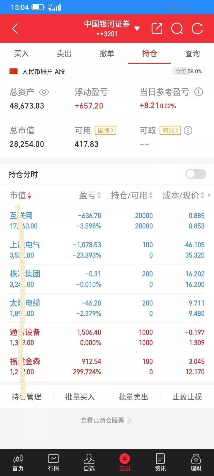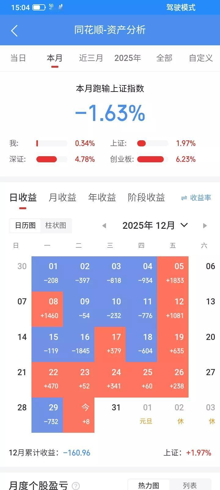 2025.12.30,今天上证指数大幅低开高走,依然强势,但是我又没有坚持自己的交易计划,匆忙追涨杀跌,买的下跌,没有买的上涨,左右打脸。 昨天清仓止损了的株冶今天跳空低开,怕继续下跌,反弹上涨了都不敢买,想等回落到均线再买,但是一路反弹上涨,买入价不断提高还是没有买到,又错过了,收盘以16.20买入200股。低价买不到就高价买了吧。万一上涨踏空了就太难受了。下跌就再多亏一点吧。 昨天卖掉的通信设备etf今天早上又大幅上涨,后悔不已,还好收盘跌下来一些给我一点点安慰。 金森又继续下跌,反弹的时候又觉得昨天卖错了,回落中以12.22又买回来100股,但是买入之后就下跌了,又买错了,收盘以12.17卖掉100股,又多亏了6块钱。 上能也是差不多,低开低走然后反弹,又怕错过了上涨,回落中以35.40买入100股,买入之后就下跌了,但是下午又拉起来,最高拉到35.63又贪心,想赚更多,没有卖就下跌了,又买错了,收盘以35.32卖掉,又多亏了10块钱。 早上太阳逆市上涨,看起来很强势的样子,又没有管住手,以9.76追高买入100股,回落中以9.66又补仓100股,收盘又跌下来了,亏了40多块钱。 互联网etf今天低开高走,低开不敢买,怕继续下跌,但是开盘价就是最低价,反弹上涨,回落中以0.845买入5000股,买入之后上涨到0.848然后回落,回落中以0.846又买入5000股,但是成交之后就下跌了,最低又跌回0.842,又买贵了,还好,没有继续下跌,收盘还上涨了一点点,上涨按照计划是应该买入,就不做t了,赚70块钱,再继续持股待涨吧,明天再卖吧。 今天该买的没有买,不该买的买了,本来该赚钱的,反而又是亏钱。今天总市值2.82万元,总资产4.86万元,今天总体账户勉强翻红,浮盈8块钱。今年亏了4600多块。
