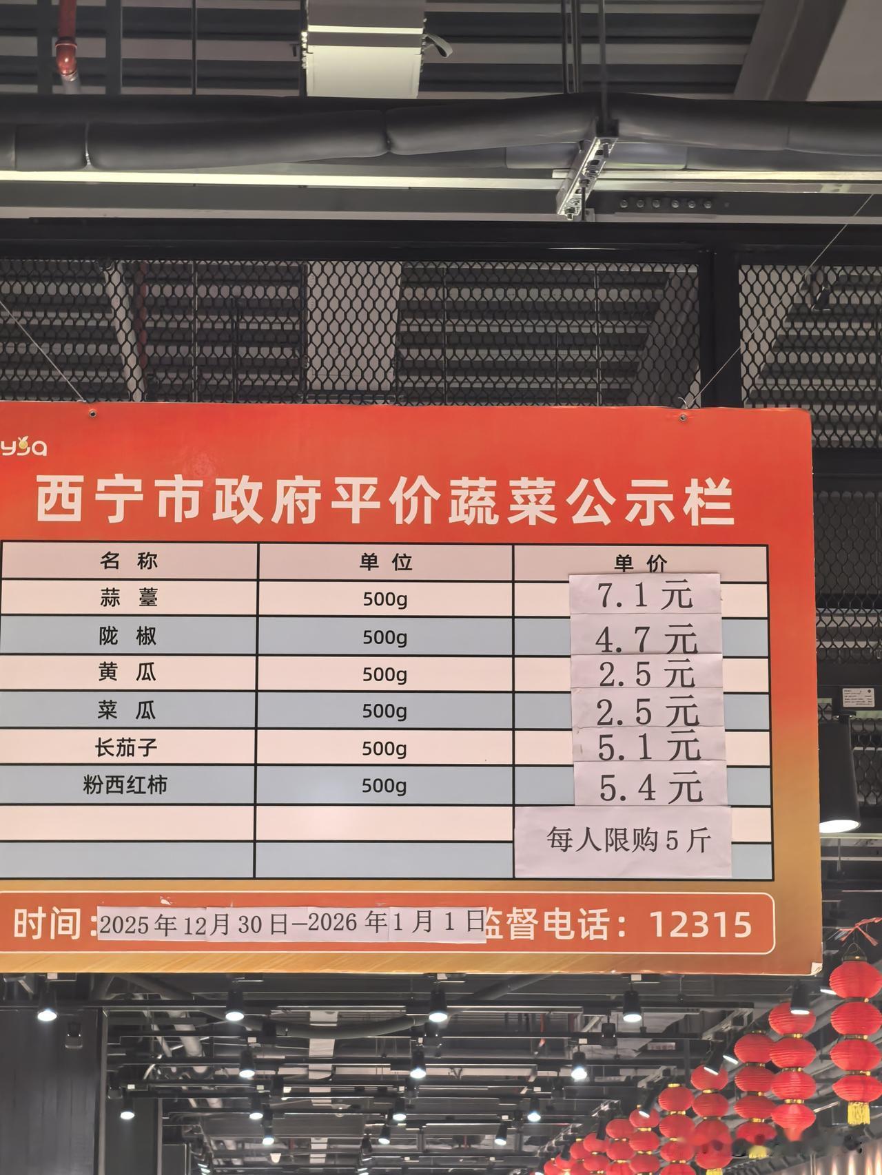 听说西宁的政府平价菜从今天开始供应,于是一大早便赶到超市凑热闹。 走进一家亲生物园店,上午十一点多,店里人并不太多。几位员工正架着梯子挂起红灯笼,装点出跨年迎节的气氛。不得不说,一排排灯笼悬上屋梁,顿时喜气洋溢,节日的氛围也被烘托得满满当当。 蔬菜区柜台上方悬挂着“西宁市政府平价菜销售网点”的横幅,六种菜品的价目表贴在称重处旁边。仔细一看价格,着实令人吃惊,还限购,再观察前来选购的顾客,也不算多。看来大家对这批政府平价菜并不太上心,反应也颇为平静。 往年还有平价鸡蛋供应,今年也取消了,肉类更是没门。 不过,心里还是挺知足的。这份心意,老百姓领了。 但愿新的一年,财源滚滚,万事如意发大财比什么都好对吧! 冬日生活打卡季