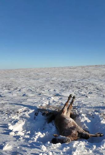 呼伦贝尔,一男子和朋友自驾游,忽然发现一匹马卧在路边雪堆里一动不动,本以为马是冻