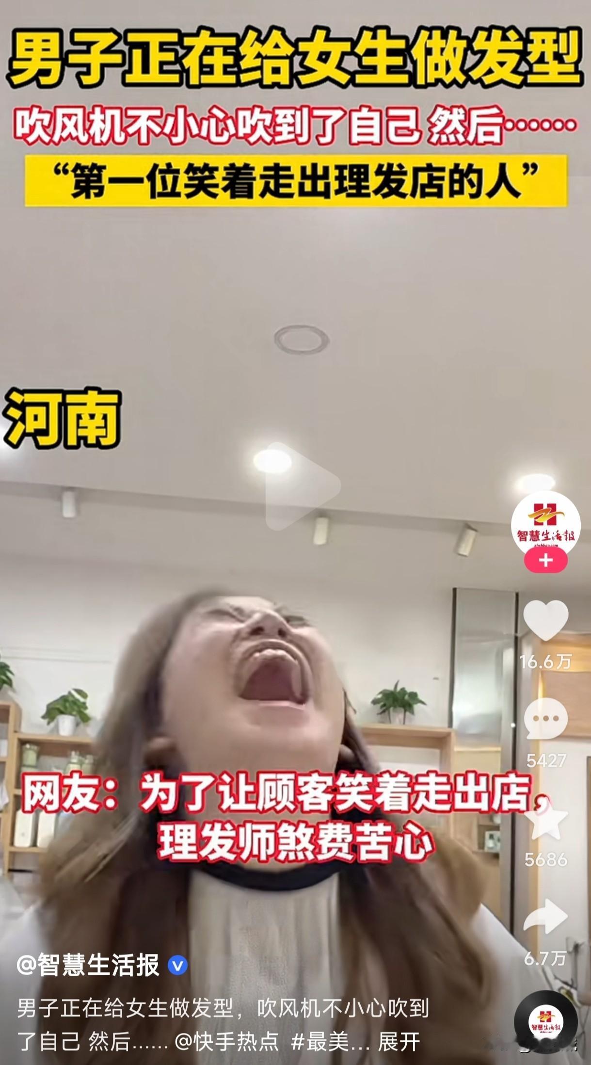 理发师正在给女子做发型,吹风机不小心吹到了自己,谁能想到吹掉了假发露出了谢顶的光头,女子顿时开怀大笑。 我以为理发店那些托尼老师的头发旺盛的像森林一样都是真的,原来有些理发师的头发也和我们普通人的一样,不是谢顶严重就是秃头,他们原来戴的也是假发,这可真是让我开了眼了。 这女子前一秒还面无表情的坐着,下一秒看到理发师的头发被吹走后,她停顿了几秒,顿时开怀大笑,她自己肯定都没想到理发师的头发居然也是假的,这是不是要笑死人的节奏,给顾客吹头发,居然把自己的假发给吹走了。 不管这是段子也罢还是真实生活也好,理发师的这操作瞬间让顾客的心情爆好,这女子进店时愁眉苦脸,离店时开怀大笑,她以后注定是这家店的常客,因为理发师能让自己心情变好不是吗?