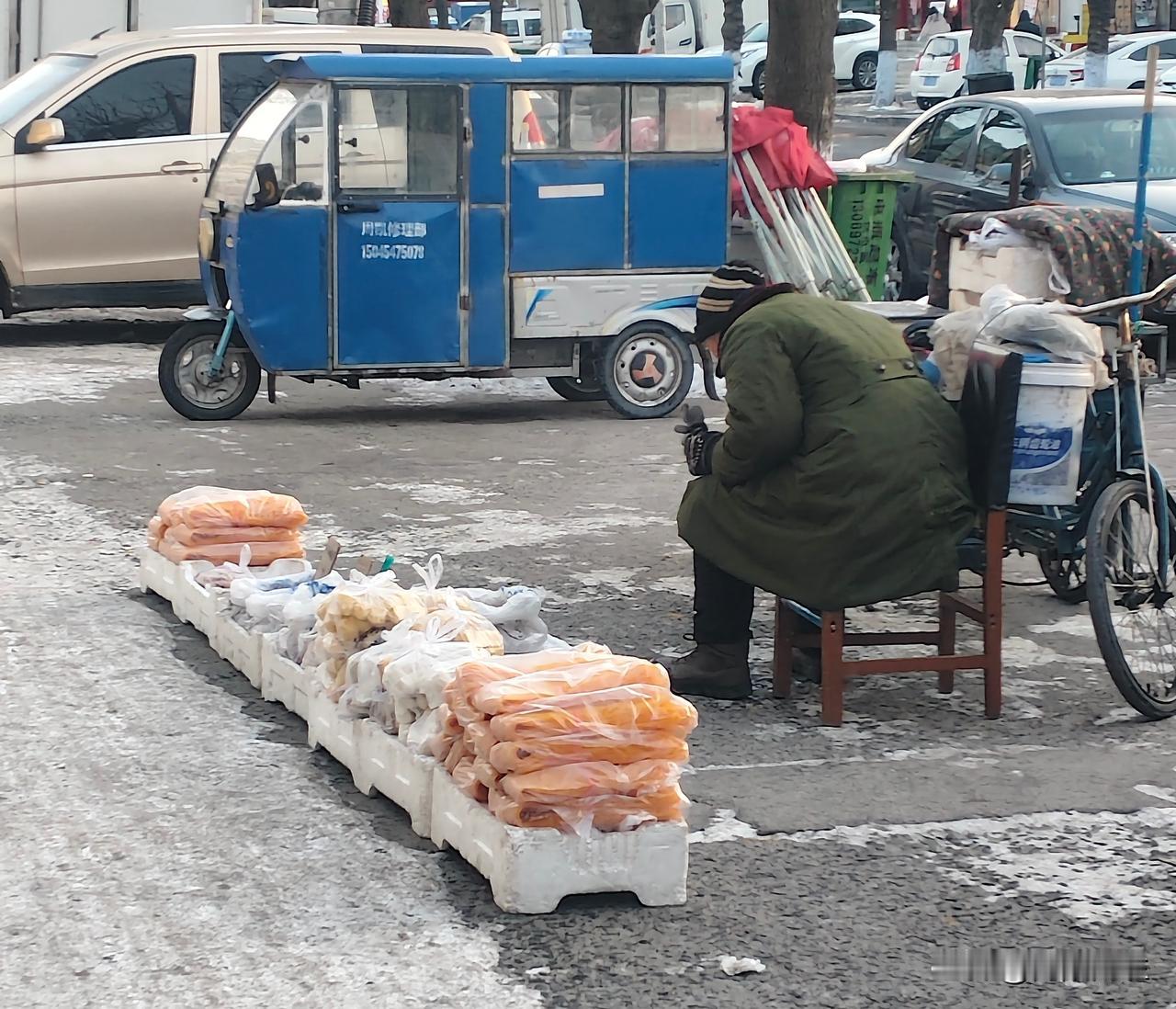 黑龙江的早市, 天刚蒙蒙亮就冒起了热气儿。 摆摊的大多是头发花白的大爷大妈, 推着小车, 守着自家种的青菜、笨鸡蛋, 还有冻得邦邦硬的粘豆包。 他们裹着厚棉袄搓着手, 嗓门洪亮地吆喝, 冻红的脸上挂着笑, 守着这一方小摊位,早市 早市食材 街头早市 东北早市蔬菜 特色早市 东北早市儿 黑龙江早市 黑河早市儿 攒着细碎又踏实的小日子。