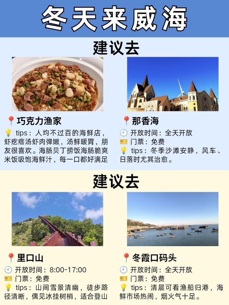 1️⃣我们第一天中午到的威海,然后直接奔酒店放行李,下午就在国际海水浴场溜达。冬天海边人不多,风挺大,但海特别蓝,还能看见一点点冰碴儿,拍照很有感觉。晚上我们去巧克力渔家搓了一顿,海肠捞饭真绝了,鲜得不行