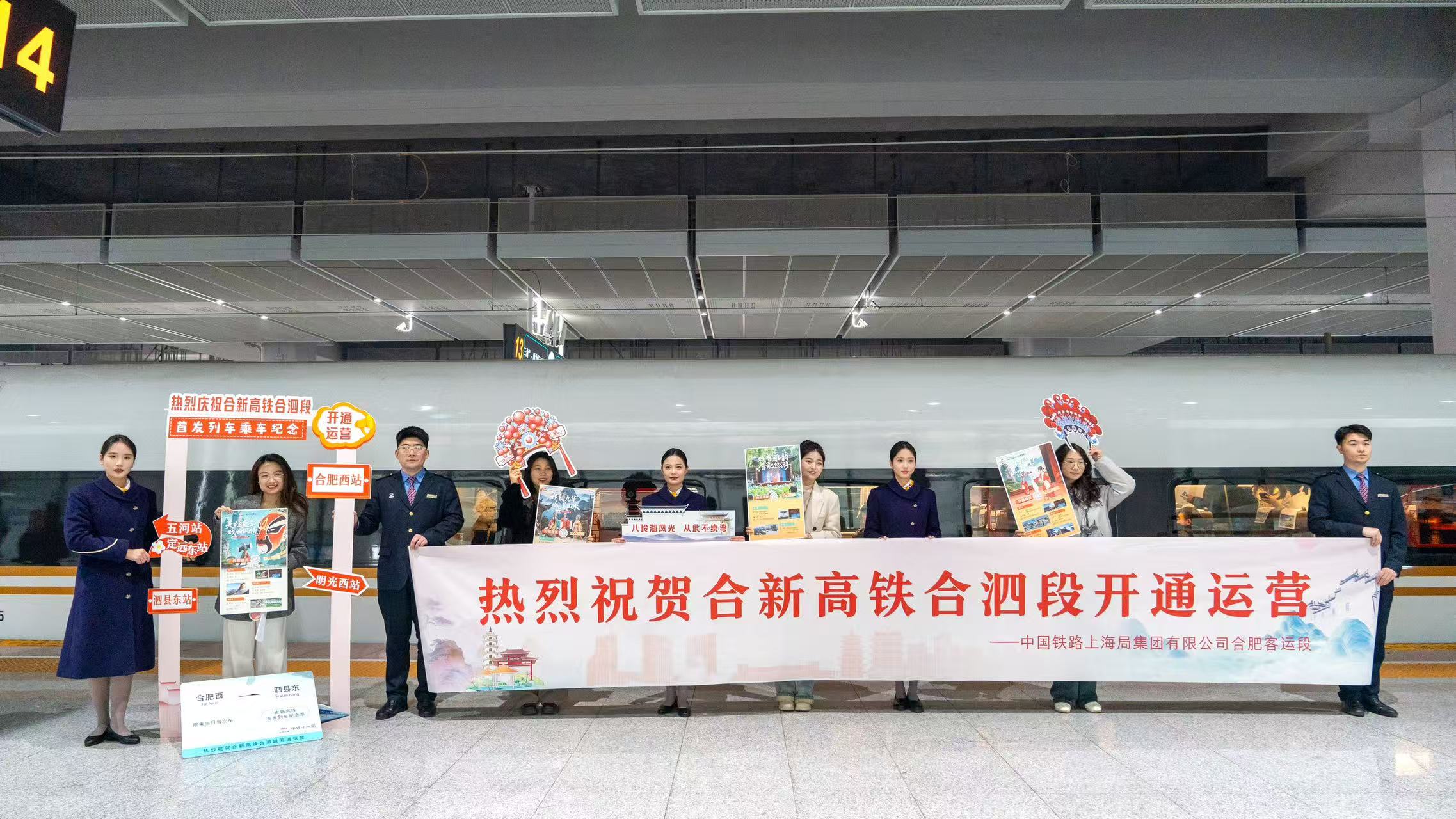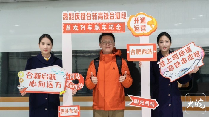 清晨的合肥西站暖意融融,站房内装饰一新,站台上“热烈祝贺合新高铁合泗段开通运营”的红色标语随处可见,喜庆氛围感拉满。不少市民早早来到站台,在首发列车主题打卡点合影留念,随后有序通过安检,登上G9500次首趟列车,共同见证这一历史性时刻。
