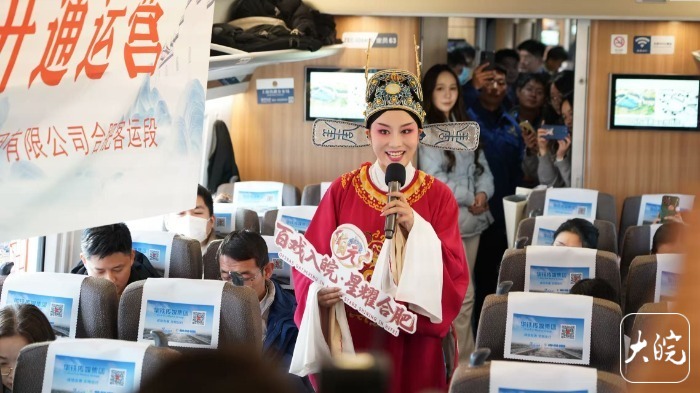 列车缓缓启动,平稳驶向泗县方向。不久后,车厢内响起悠扬的音乐,上铁集团合肥客运段准备的黄梅戏《女驸马》片段开始演绎,悠扬的唱腔为旅程注入浓浓的安徽风情,引得乘客纷纷拿出手机拍摄。