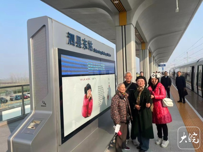 1小时15分钟后,10时31分,列车抵达泗县东站。在站台,记者遇到了拿自拍杆拍全家福打卡的孙大姐一家。她兴奋地说,特意卡点抢了四张首发车票,带着父母和妹妹来体验这趟意义非凡的旅程。“泗县我一直想去,但总觉得交通不便。现在高铁通了,我们一家就策划了这次‘首发车旅行’。”孙大姐笑着说,“我父亲是老铁路工人,看到中国高铁发展这么快,特别高兴。”