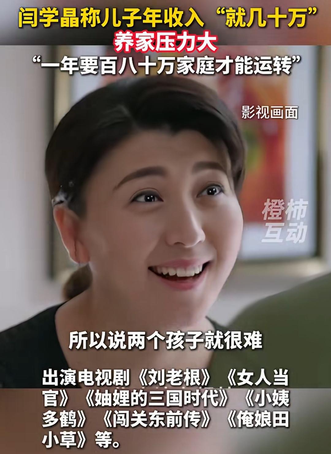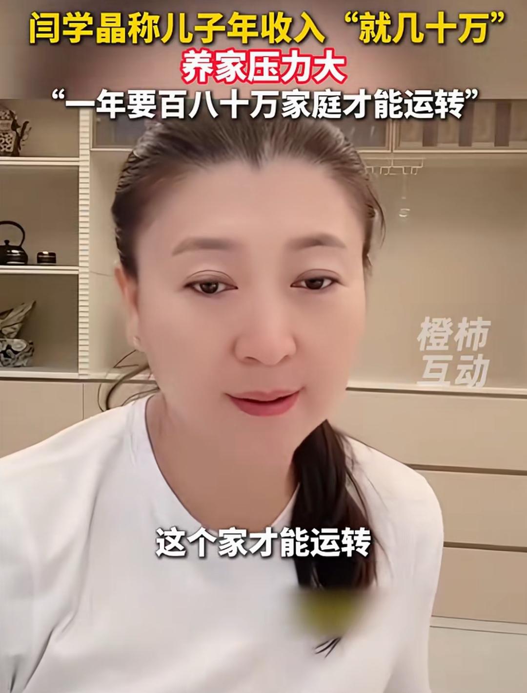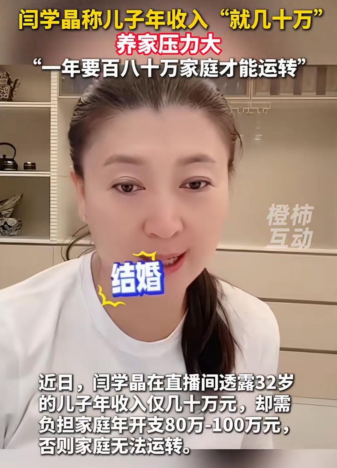 知名演员闰学晶直播间喊穷:儿子32岁了,结婚又生孩子,一年就接一部戏,只争几十万,而家庭开支一年80万~100万,否则家庭无法运转。 评论1:真是贫穷限制我的想象,一年的家庭开支就要80万~100万,一年收入大几十万,已经超过全国90%人收入了。 评论2:真的是挺穷的,一年收入不够维持家庭运转,我一个搬砖的,一个月收入8000多元,省省还有剩余。 评论3:看到偶像家庭困难,我一个吃低保的,都忍不住刷礼物。 评论4:闰姐能不能把你儿子收款码,在直播间出示一下,相信大把的人会主动给你打款。 评论5:希望国家管管演艺圈,一个公众人物,在直播间替儿子喊穷,影响太恶劣了。 真是应了,生活在山顶上的人,根本不了解山下面的人啊,一年收入几十万,已经强过95%的人,一年家庭开支100万,比我们清明节烧的纸钱还多呀!