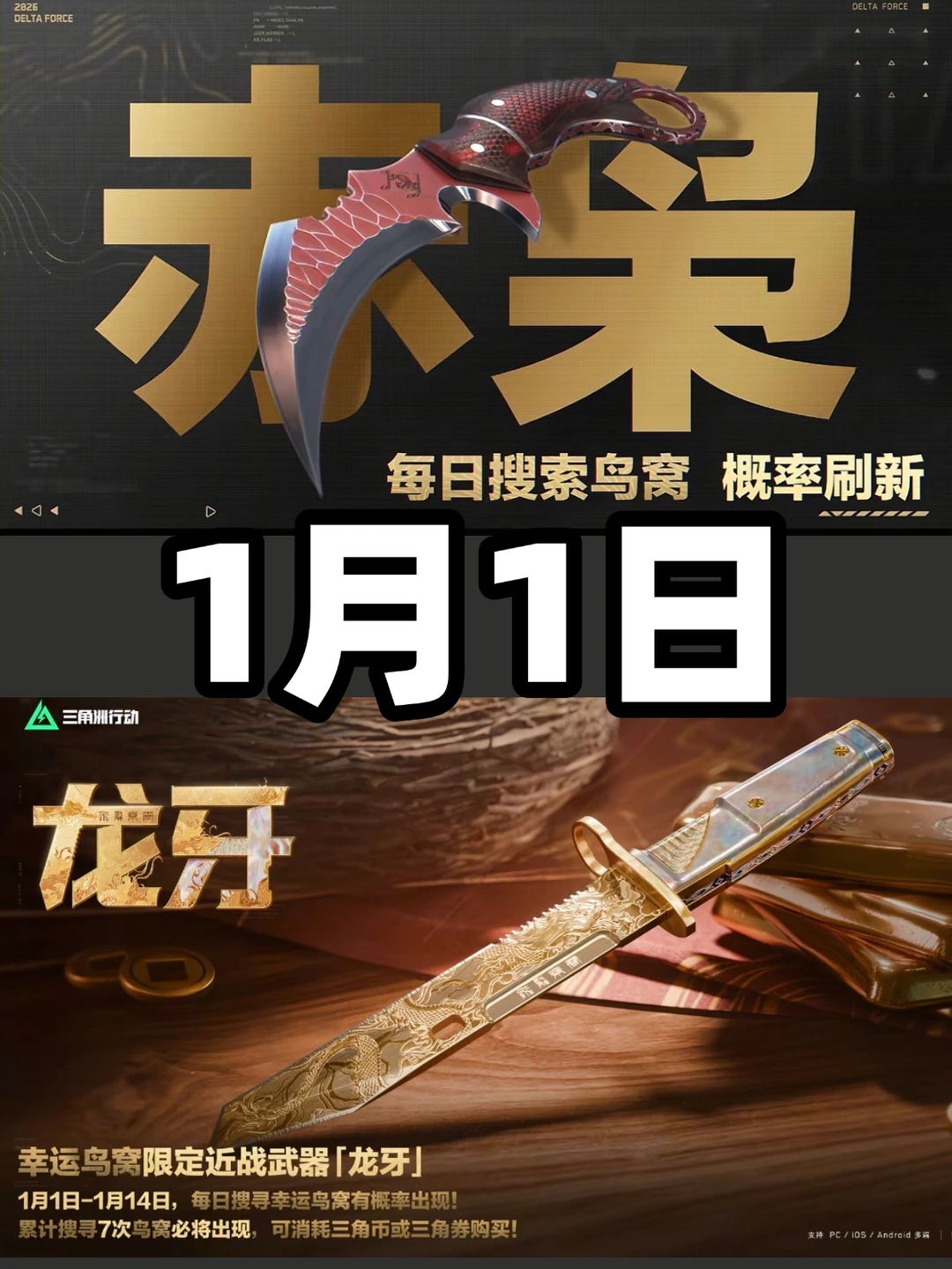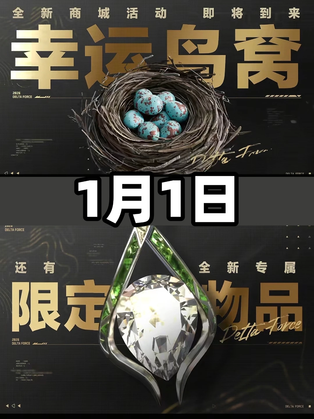 活动时间2026年1月1日0点-2026年1月14日24点 1⃣️大家每天进活动可随机搜寻5件外观商品!搜索机会将于每天0点刷新。搜鸟窝可免费开启1枚金蛋,金蛋奖励有量子密钥和图灵砖等,活动期间最多掉落7枚幸运金蛋,全部开启后不会再继续掉落。 2⃣️搜寻鸟窝还有概率获得零元幸运礼包或超级幸运礼,可开出幸运好礼和免费领取当天鸟窝搜寻到的全部商品的机会 1月1日记得来三角洲跨年