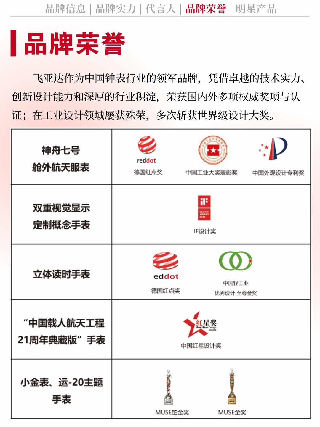 ❤️ 代言人:高圆圆是飞亚达自 2011 年起长期合作的核心品牌代言人。以其优雅知性的公众形象提升了品牌调性,通过深度参与产品理念诠释与文化表达,成为飞亚达“勇敢时刻”“东方美学”与“女性力量”等核心价值的重要传递者