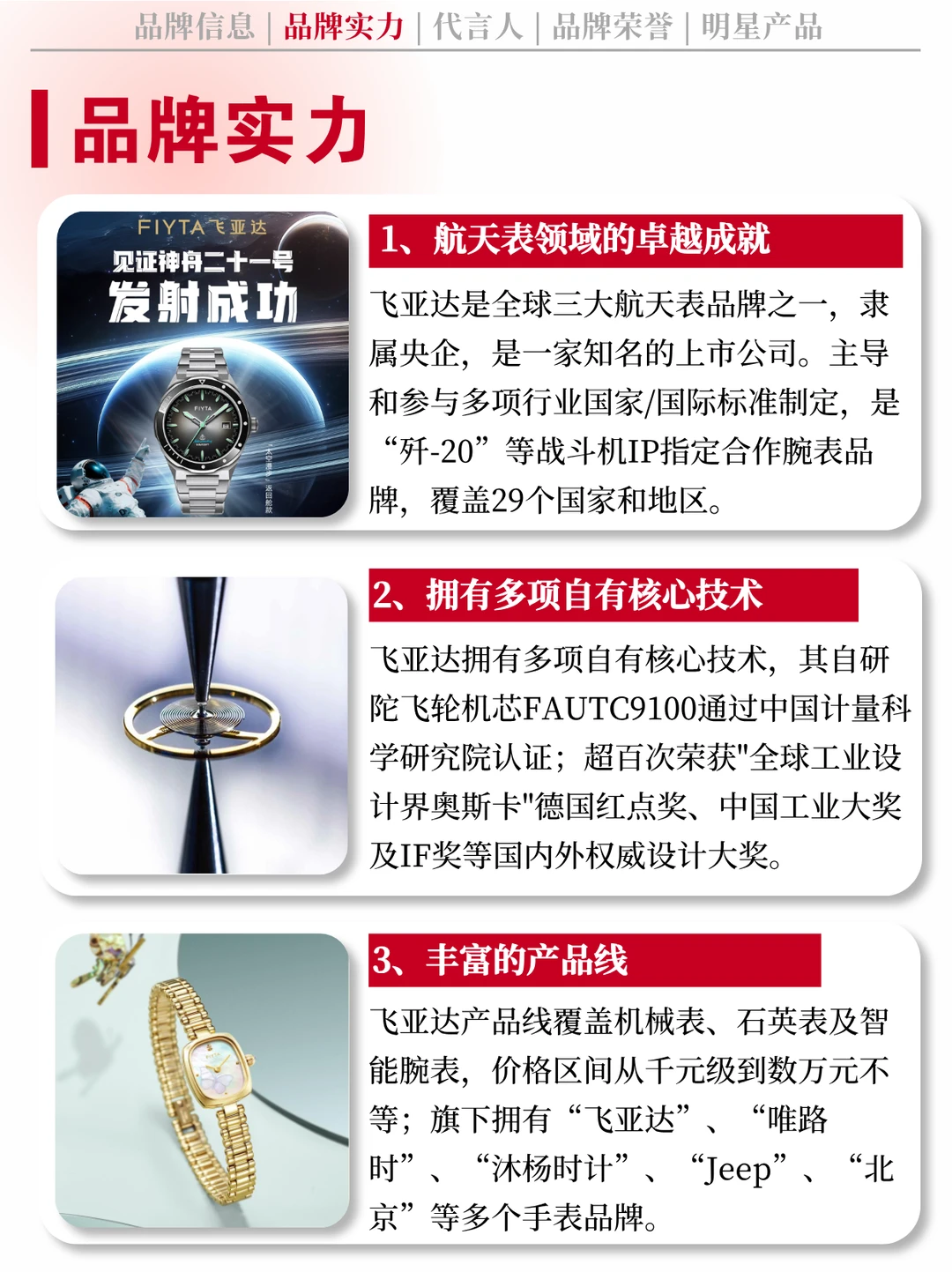 🤗 飞亚达(Fiyta)创立于1987年,深深根植于中国文化传统,将五千年华夏文明的艺术瑰宝与现代制表技艺完美融合。👉 作为中国钟表行业的知名品牌,飞亚达始终将中国文化与东方美学作为品牌发展的核心灵魂,通过精湛的制表工艺和深厚的设计底蕴,将中华文明的璀璨瑰宝凝练于方寸表盘之间。这既体现了品牌对中国传统工艺和制表技艺的信心,也彰显了其文化自信与民族自豪之情。👍 在专业领域,飞亚达秉持航空级精密标准,将航天科技与制表艺术紧密结合;作为"中国航天事业支持商",自神舟五号起,飞亚达以高科技、"0"失误的卓越品质,持续助力中国载人航天事业。截至2025年9月,已累计15次参与中国载人航天地面训练与太空任务,记录探索每一秒。