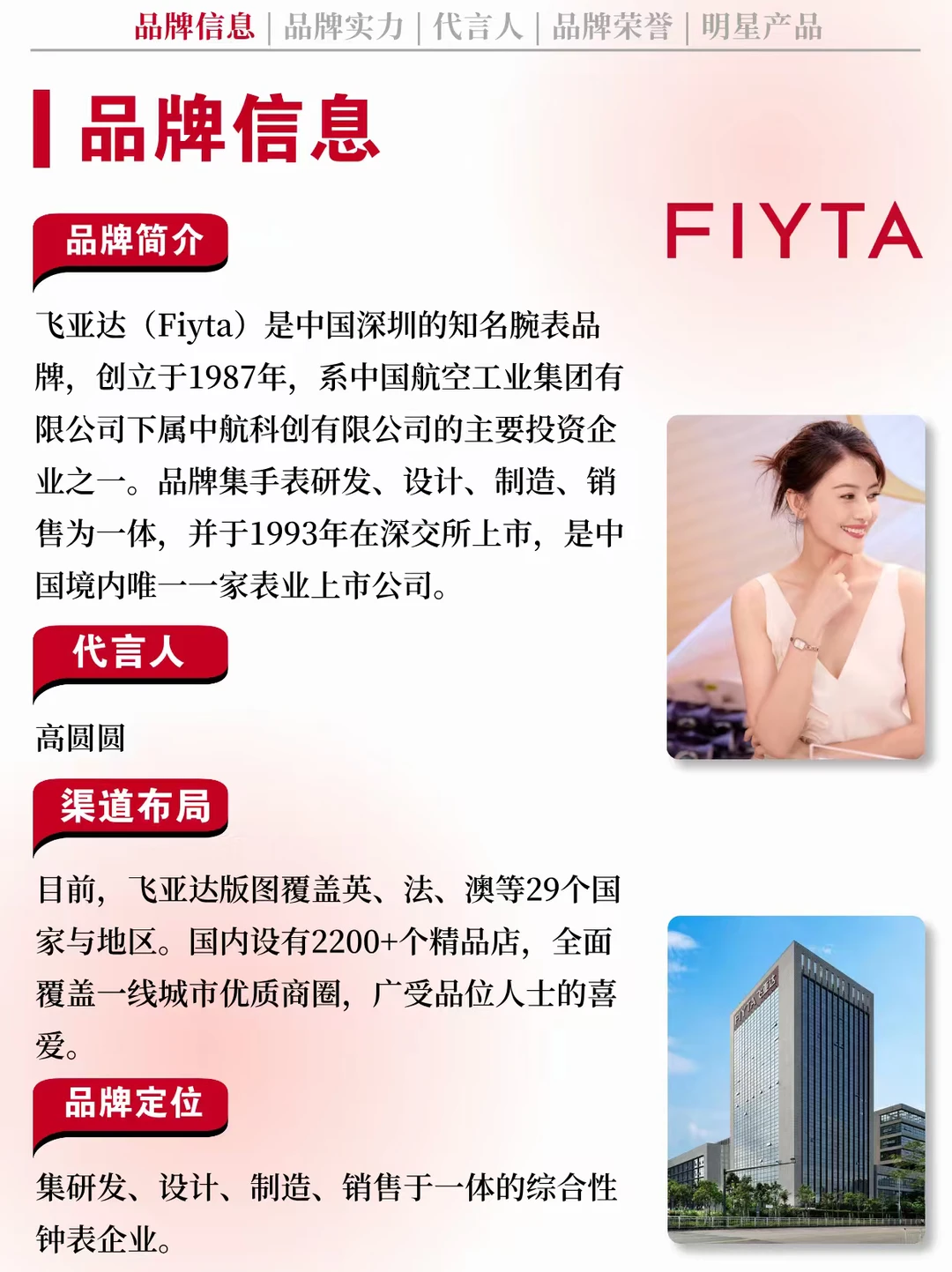 [向右R] 品牌简介:飞亚达(Fiyta)是中国深圳的知名腕表品牌,创立于1987年,系中国航空工业集团有限公司下属中航科创有限公司的主要投资企业之一。品牌集手表研发、设计、制造、销售为一体,并于1993年在深交所上市,是中国境内唯一一家表业上市公司。