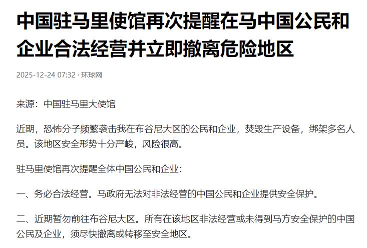 紧急通知!中国大使馆12月27日凌晨发文。要求中国公民立即撤离!!!看见这个新闻的时候,我还以为是日本那边的。毕竟中日这事已经闹了那么久,真到了不可挽回的地步,也都正常。点开一看是马里的,位置在布谷尼大区。 可能很多朋友和我一样,对马里的印象还停留在“遥远的非洲国家”,甚至不知道布谷尼大区在哪,但能让中国使馆连发多次提醒、最终深夜下达撤离令,这片土地的危险程度,早已超出了我们的想象。 先给大家说一组实打实的消息,都是权威信源披露的:从2025年下半年开始,布谷尼大区就成了恐怖分子的“狩猎场”,而中国公民和中资企业,成了他们重点针对的目标。 7月份,当地一家中资矿场遭到极端组织“支持伊斯兰和穆斯林组织”(JNIM)袭击,5名中国公民被绑架,矿场里的设备被一把火烧得精光;到了12月,恐怖分子更是变本加厉,接连突袭布谷尼大区的中资站点,烧设备、绑人质的事件接连上演,已经有多名同胞遭遇危险,甚至不幸遇难。 可能有人会问,为什么偏偏是布谷尼大区?为什么针对中国公民?答案其实很现实:布谷尼大区距离马里首都巴马科只有170公里,原本是当地棉花加工和运输的核心枢纽,更关键的是,这里是马里非法采金的聚集地之一。 不少中国公民为了追求利益,跑到这里从事非法采金活动,而这些采金点大多没有正规手续,更没有基本的安防设施,在恐怖分子眼里,就是“手到擒来”的目标。更让人揪心的是,马里政府对这片区域的管控能力几乎为零,恐怖分子光天化日之下发动袭击,事后能从容撤离,当地警方根本无力应对,留在那的同胞,相当于暴露在毫无防护的危险中。 使馆的撤离通知里,有一句话特别值得注意:“非法经营的中国公民无法获得马方安全保护”。这句话看似冰冷,实则戳中了关键问题。很多在布谷尼的同胞,明知非法采金不受当地法律保护,却抱着“赌一把”的侥幸心理,觉得恐怖袭击不会落到自己头上。 早在12月4日,使馆就已经发出过预警,要求非法采金人员立即停工撤离,当时不少人听从提醒及时转移,成功避开了后续的恐袭,但仍有部分人执迷不悟,要么拒不撤离,要么撤离后又偷偷返回,这才让使馆不得不再次发布紧急通知,用最严厉的语气敲响警钟。 可能还有朋友疑惑,马里的局势怎么突然就恶化到这种地步?其实这不是“突然”,而是多年动荡的必然结果。马里是西非的内陆国家,曾经靠着黄金贸易辉煌过,但殖民遗留的族群矛盾、资源分配问题,再加上2011年阿拉伯之春后极端组织的渗透,让这个国家彻底陷入了混乱。 2012年爆发战争,2020年、2021年接连发生政变,2024年又和邻国一起退出西非经共体,国内局势一直处于失控边缘。极端势力从北部向中部、南部扩散,原本相对稳定的布谷尼大区所在的锡卡索行政区,如今也被恐袭阴影笼罩。就在12月6日,布谷尼附近的油罐车车队还遭到伏击,造成多名平民和士兵丧生,极端组织JNIM甚至公开宣称负责。 更让人无奈的是,马里政府的应对能力极其有限。为了缓解燃油危机,他们曾和极端组织达成停火协议,释放151名圣战成员换取一个月缓冲期,可协议刚到期,恐袭就再次爆发。这种治标不治本的做法,只会让极端势力更加嚣张。 对于在马里的外国公民来说,当地政府的保护基本形同虚设,尤其是在首都巴马科以外的地区,安全只能靠自己。就连联合国驻马里维和部队,近期也遭遇袭击,造成中国维和人员1人牺牲、4人受伤,足以见得当地局势的凶险程度。 此次使馆凌晨发文,不仅是对近期安全事件的回应,更是对同胞生命安全的守护。通知里还详细附上了各类应急联系方式:马里当地报警电话17、80333等,驻马里使馆领事保护电话+223-78110040,还有外交部全球应急呼叫中心电话+86-10-12308,这些号码看似简单,却是关键时刻能救命的通道,建议在马里的同胞都存好,必要时第一时间求助。 在这里也想给在海外打拼的同胞提个醒:海外求财不易,但生命永远比利益重要。布谷尼大区的悲剧,本质上是非法经营与高风险区域叠加的结果。那些无视预警、执意留在危险地区的人,不仅把自己置于险境,也给使馆的领事保护工作增加了难度。 使馆能做的,是及时传递预警、提供应急帮助,但无法为无视规则的人兜底。现在马里的局势短期内很难好转,极端组织的威胁还会持续,听从使馆提醒,尽快撤离到巴马科等相对安全的区域,或者直接离开马里,才是对自己和家人最负责的选择。 可能还有人觉得,布谷尼大区的事离自己很远,但海外安全从来都不是一句空话。希望在布谷尼大区的同胞能摒弃侥幸心理,尽快响应撤离通知,平安归来。也希望每一位海外打拼的中国人都能记住:无论身处何方,安全永远是第一位的,只有平安,才是最大的底气。