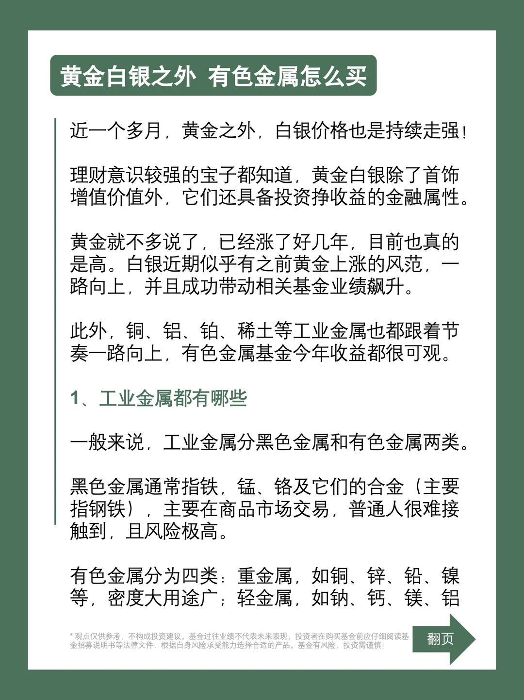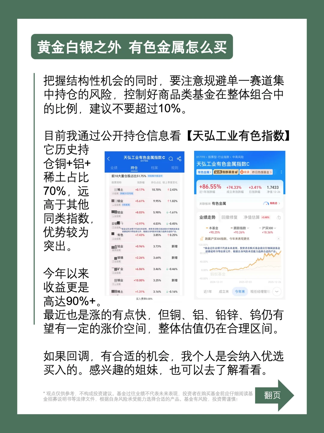 虽说有色金属预期比较好,但个人觉得有必要合理规划配置比例,科学布局。把握结构性机会的同时,要注意规避单一赛道集中持仓的风险,控制好商品类基金在整体组合中的比例,建议不要超过10%。目前通过公开披露信息看【天弘工业有色指数】 ,历史持仓铜+铝+稀土占比70%,远高于其他同类指数,今年以来收益高达90%+。最近涨的有点快,但铜、铝、铅锌、钨仍有一定涨价空间,如果回调有合适的机会,我个人会优选买入。感兴趣的姐妹,也可以去了解看看。(基金有风险,投资需谨慎)