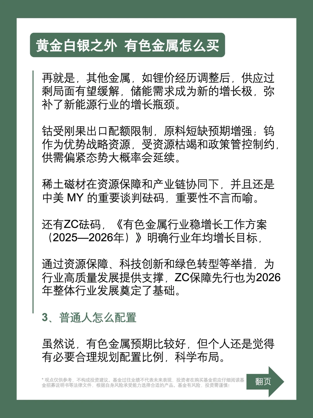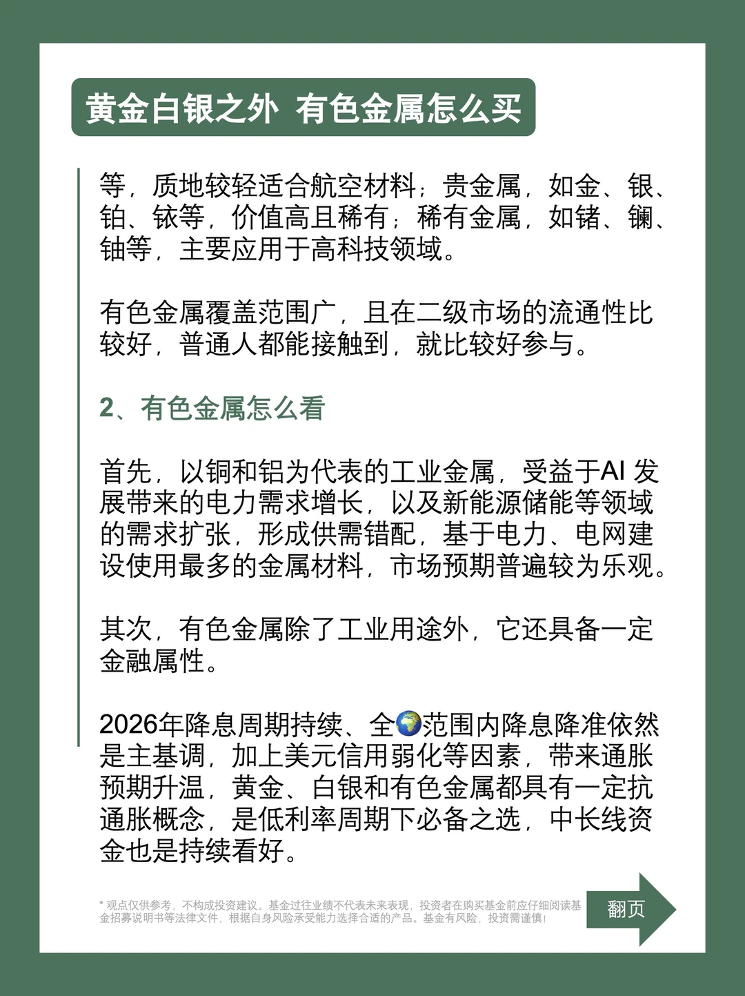 首先以铜和铝为代表的工业金属,受益于AI发展带来的电力需求增长,以及新能源储能等领域的需求扩张,形成供需错配,作为电力、电网建设使用最多的金属材料,市场预期普遍较为乐观。其次除了工业用途外,黄金、白银和有色金属都有抗通胀概念,是低利率周期下必备之选,中长线资金也是持续看好。