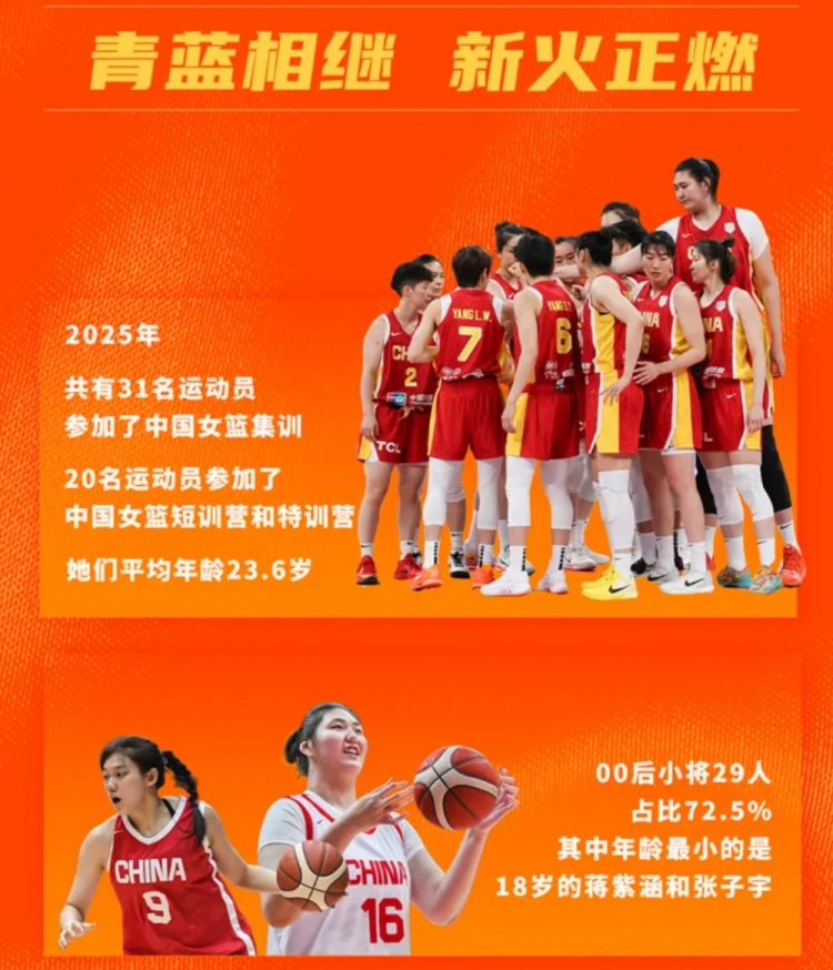 其中,2025年一共有31名女子运动员参与了中国女篮集训,20名女子运动员参加了中国女篮短训营和特训营,他们的平均年龄为23.6岁。