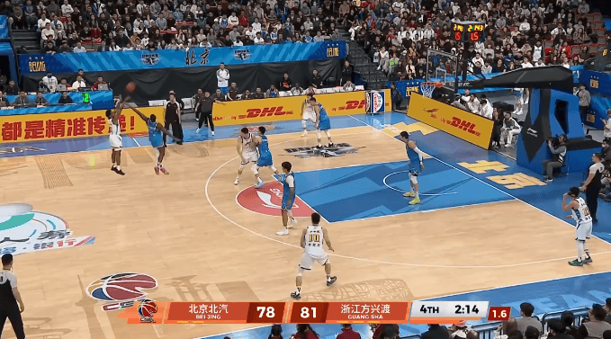 第四节比赛中,小巴里-布朗离三分线两步远超远三分投进,广厦还剩2分钟领先北京6分。