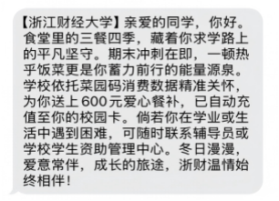 大学期末考试季已经来到。前两天,浙江财经大学的部分学生发现,自己的饭卡收到了600块钱,手机里也收到了学校的祝福短信。