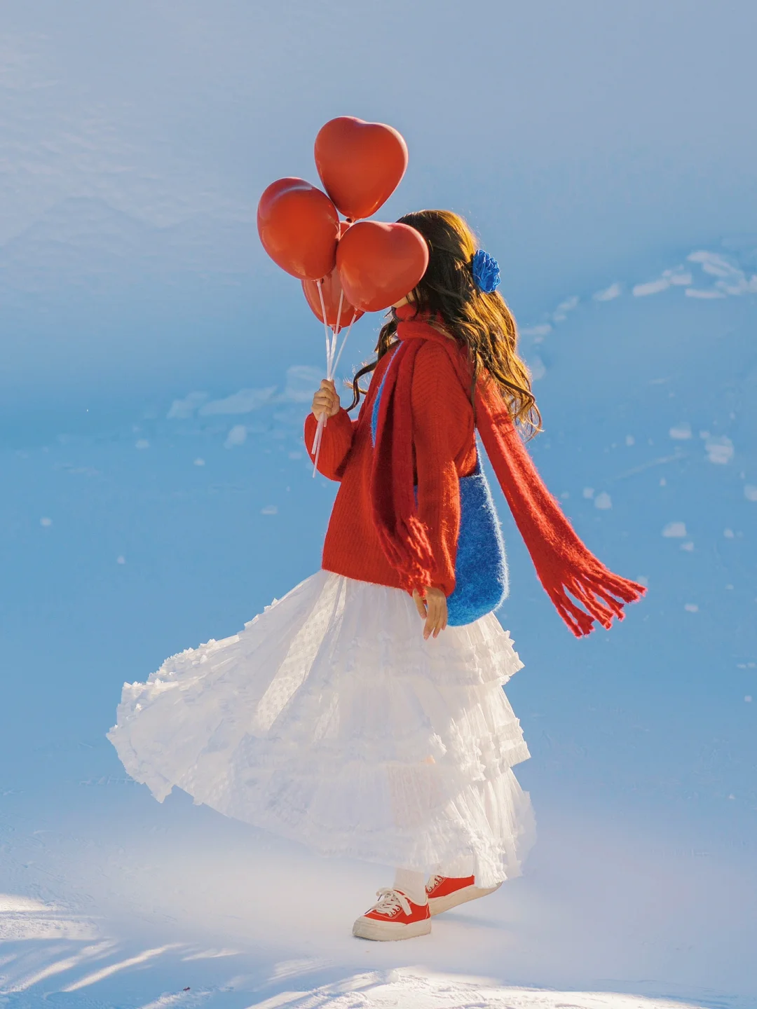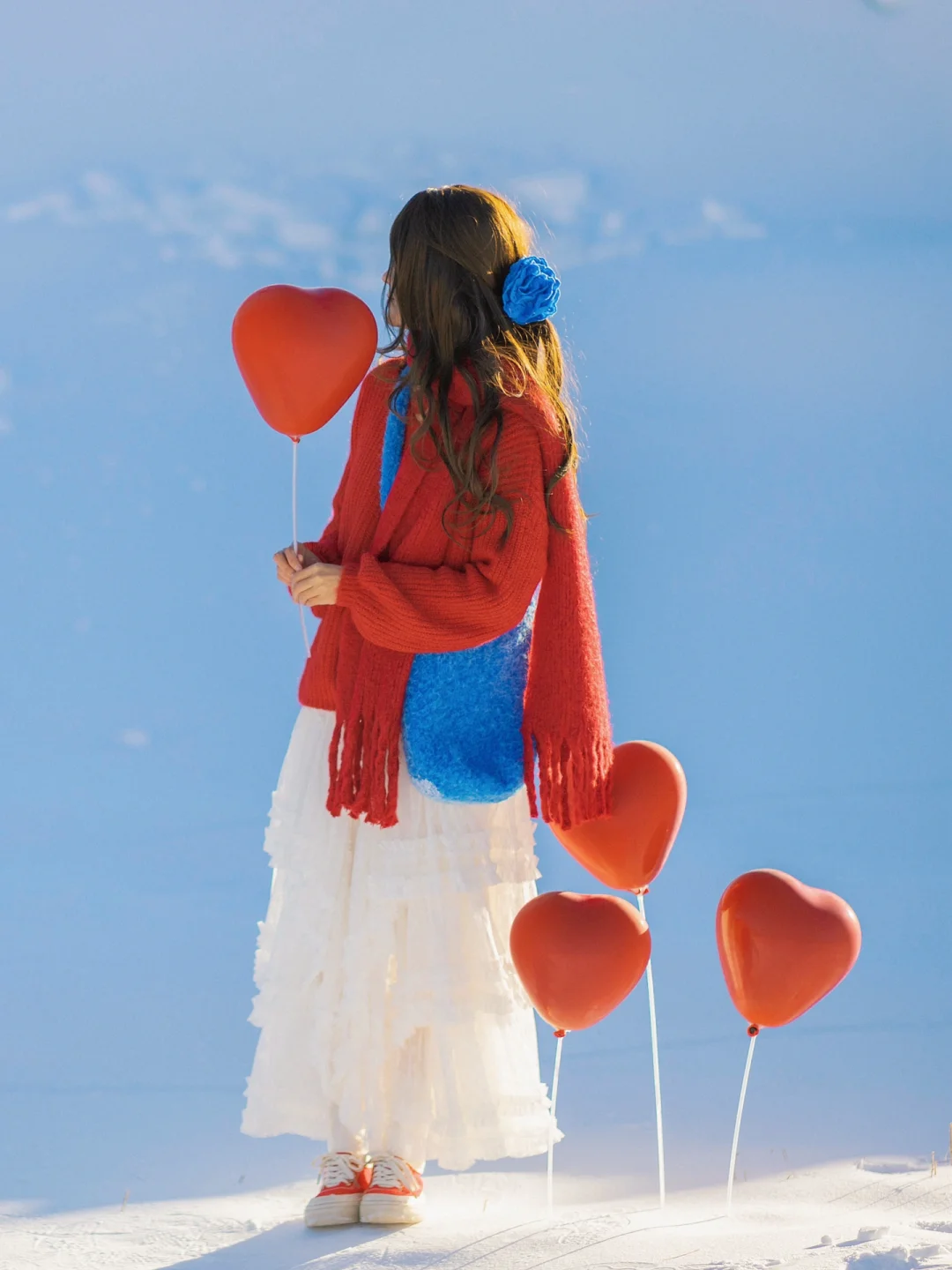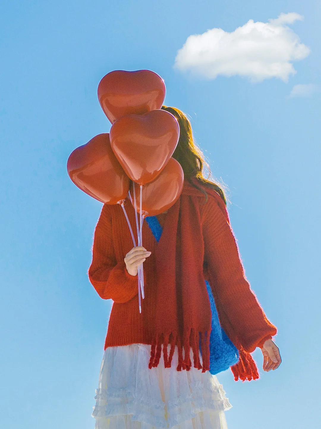 红色毛衣搭配同色系爱心气球