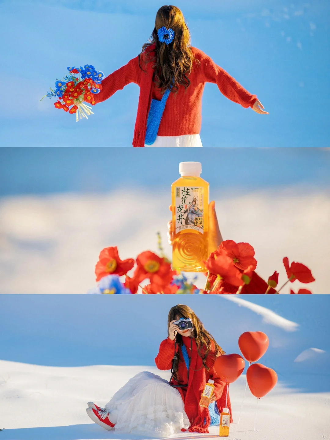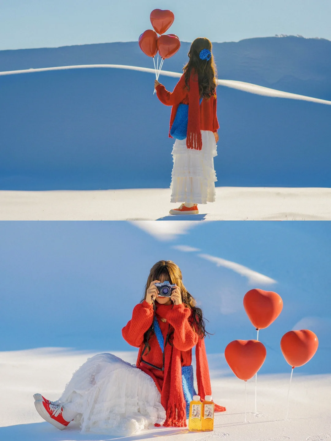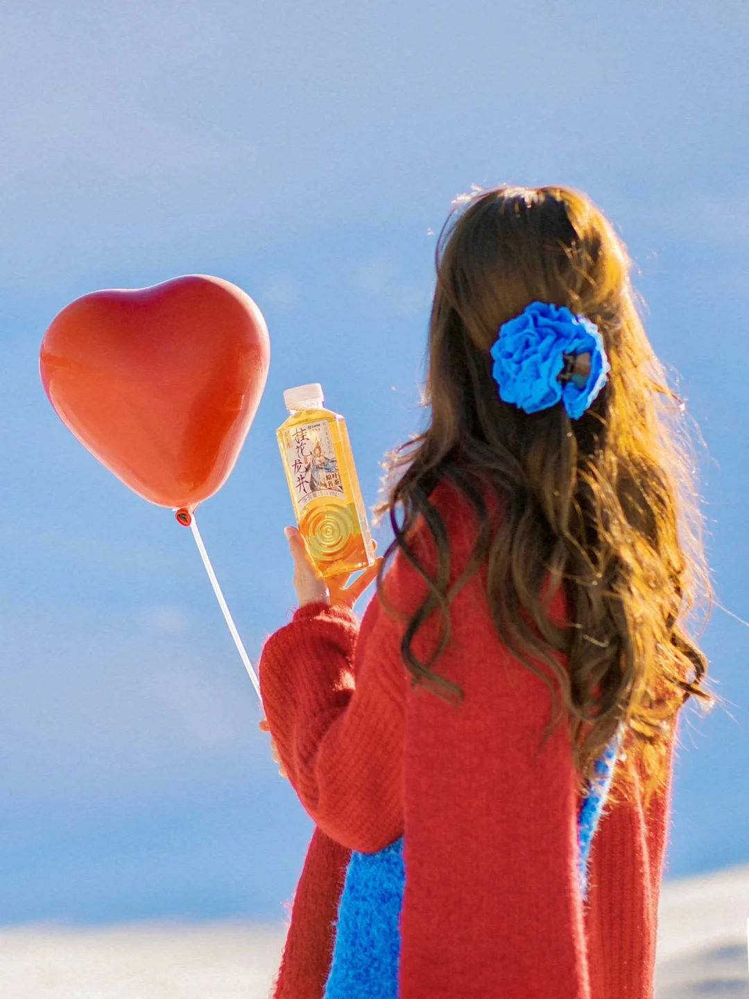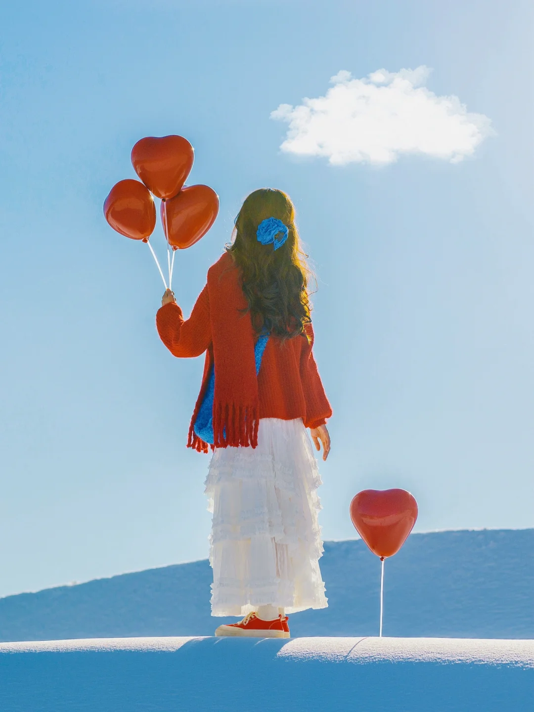 红色毛衣搭配同色系爱心气球