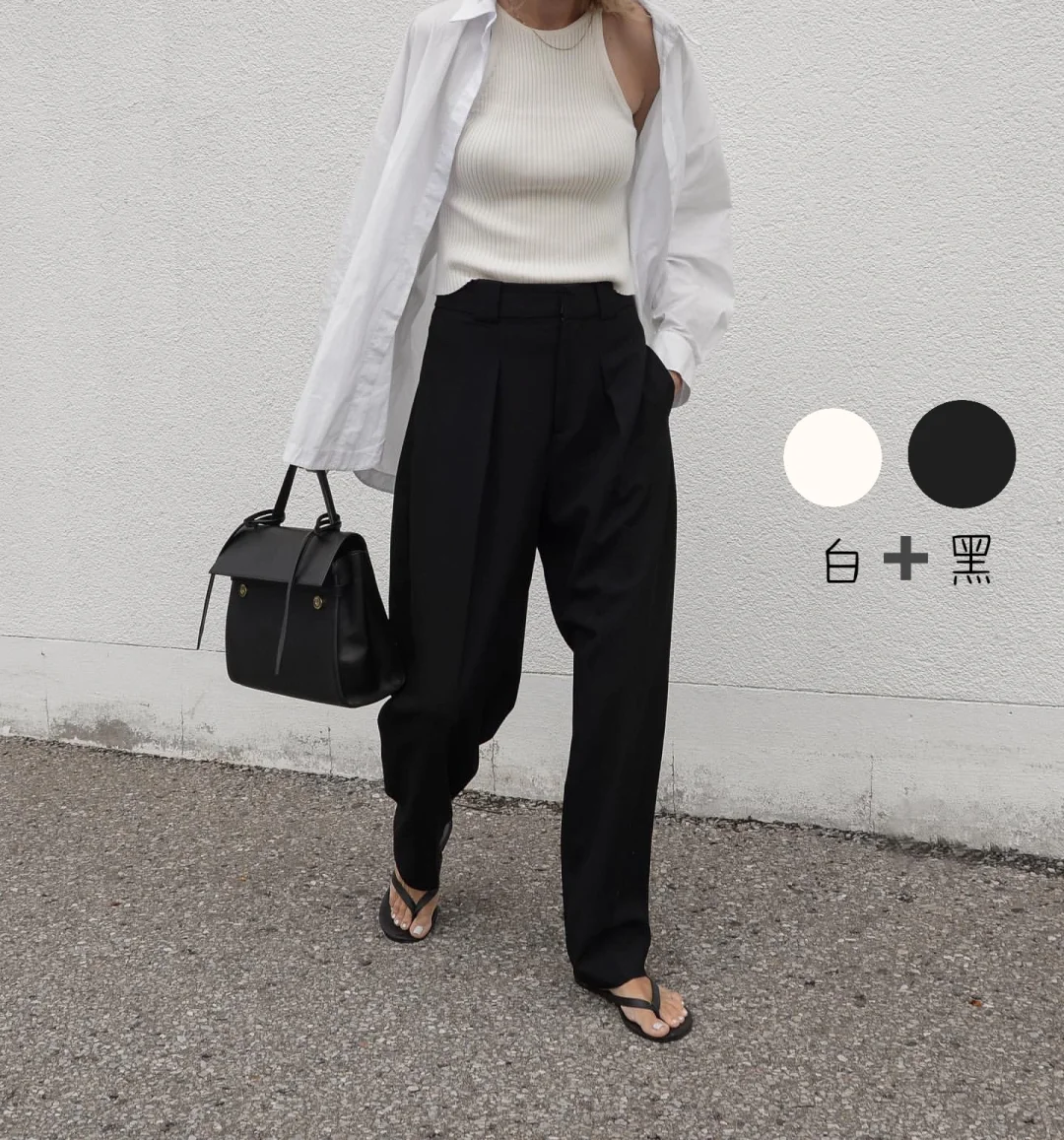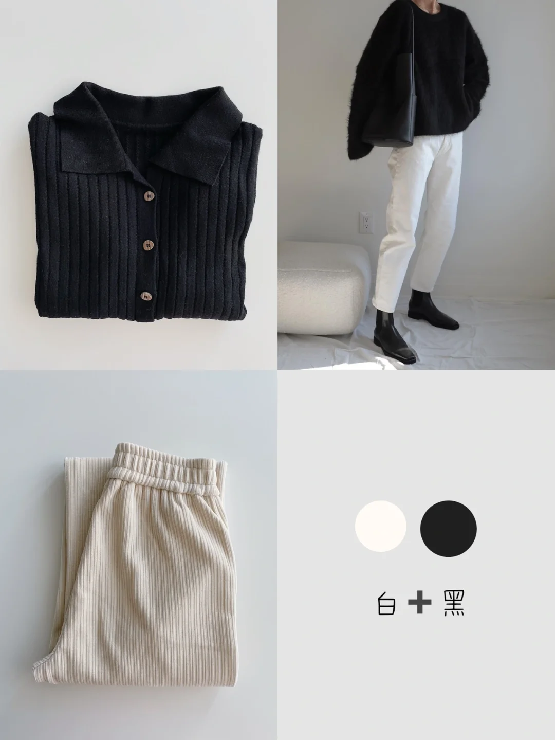 很多时候我也会黑白色系。黑白配微妙之处在于它中和了黑色的距离感和白色的亲切感。无论你怎么混搭,这两种颜色不会出错。如果你想亲切温柔感更强,将纯白色变成米白色,整个人会变的距离感更近。