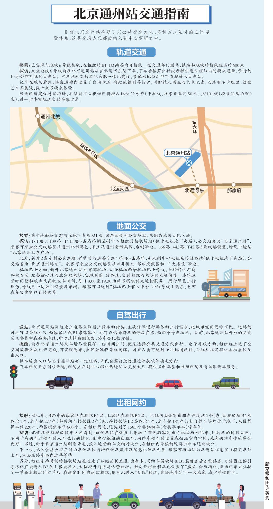 旅客抵达北京通州站后可换乘地铁6号线进入中心城区,或换乘地面公交出行。北京通州站开通后,地面公交共优化调整9条线路,覆盖中心城和通州老城区、“三大建筑”、环球度假区、重点医院等商、文、旅、医、居区域。未来,北京城市副中心综合交通枢纽内还将接入地铁22号线(平谷线)、M101线等轨道交通线路,旅客的公共交通换乘选择会更加多样。