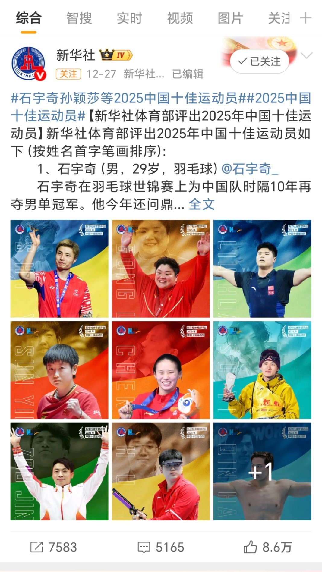 这才是含金量拉满的十佳名单!无流量掺水,全靠大赛硬成绩说话。老将坚守+中生代扛旗+新秀炸场,中国体育的传承感直接拉满!巩立姣铅球五连冠封神孙颖莎世乒赛+世界杯女单卫冕,混双三连冠;连续四年年终世界第一,52周不败扛旗国乒石宇奇终结国羽十年男单荒刘焕华破举重世界纪录陈芋汐世锦赛单人10米台四冠+双人四连冠,世泳联年度最佳女跳水运动员 苏翊鸣伤愈回归,世界杯两站1980度夺冠,赛季总冠军还有残泳蒋裕燕的励志逆袭……每一位都是实至名归!没有争议人选,全是实打实的荣誉和突破,这就是中国体育的底气!你心里的年度最佳,是不是也在这份名单里?