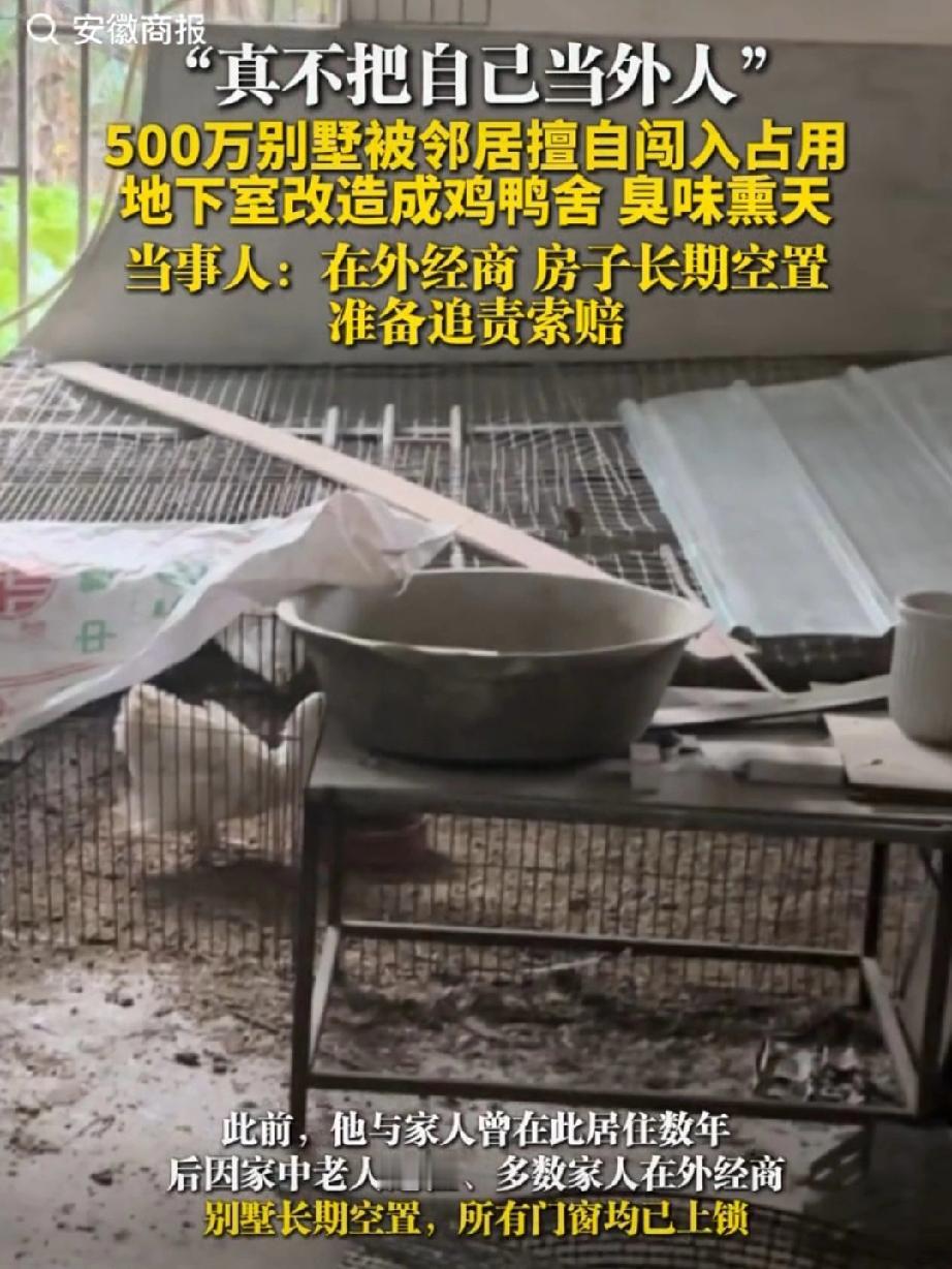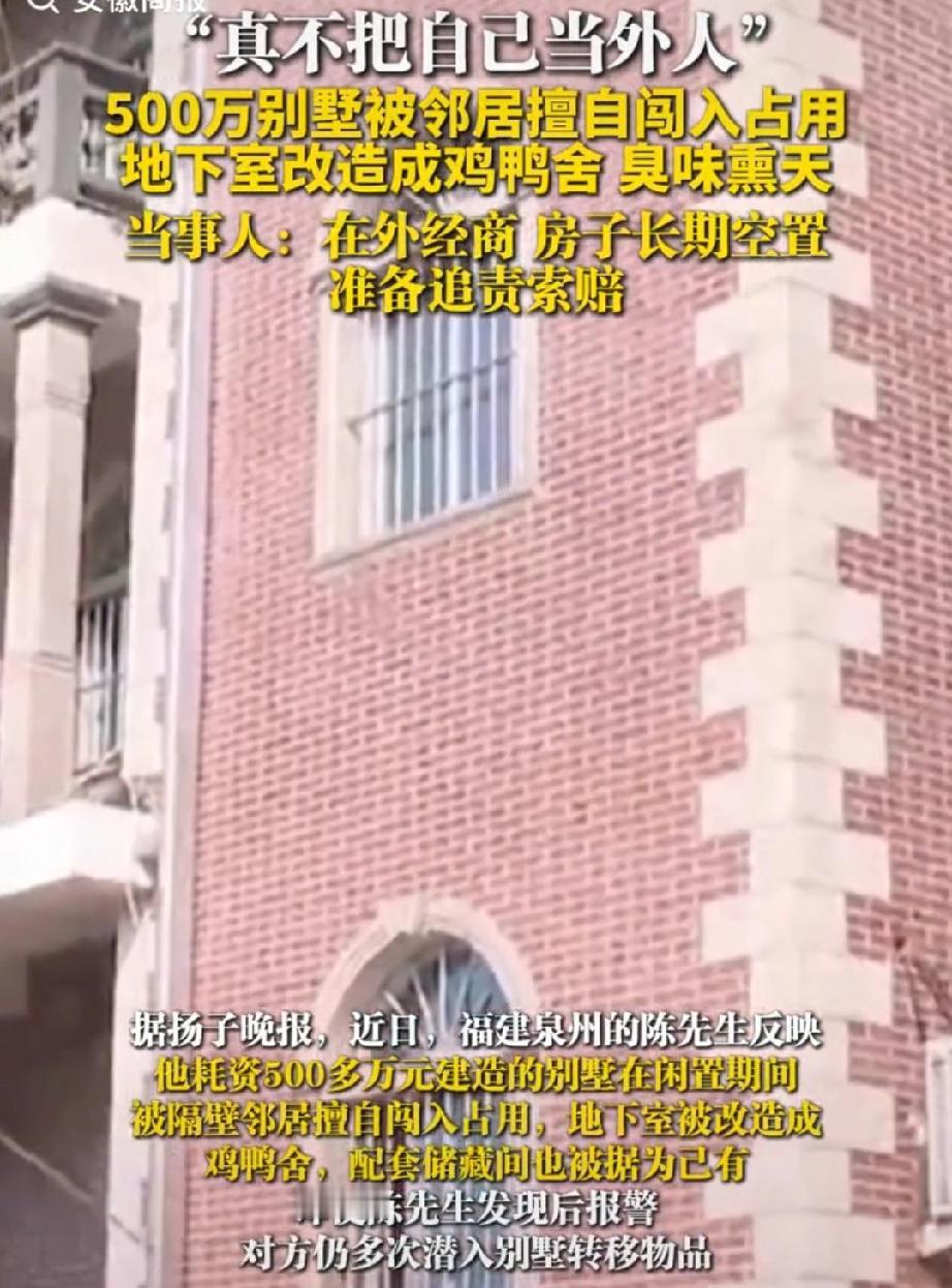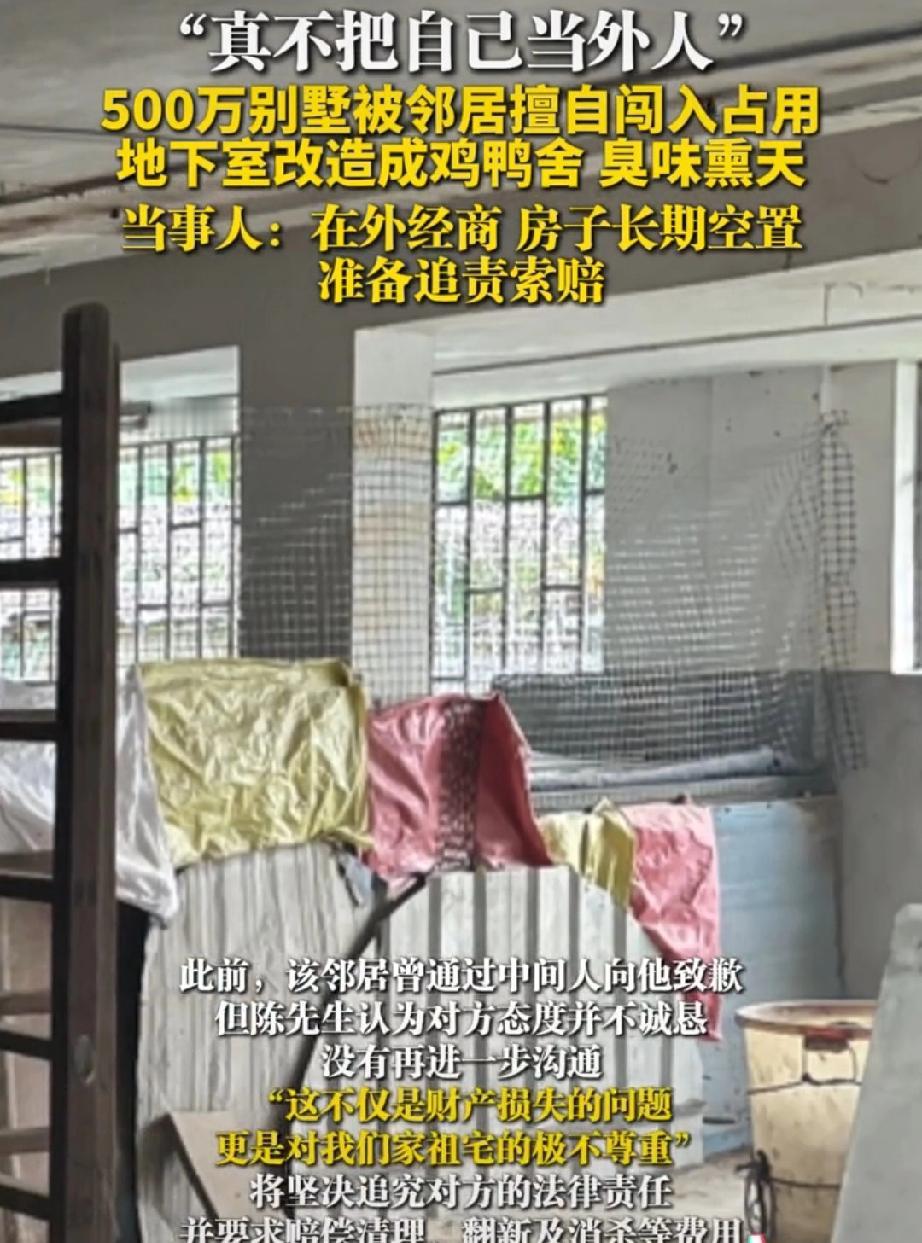 “离谱!”福建泉州的陈先生近日被气炸了!自己花500多万在老家盖的栋别墅,竟被邻居撬锁霸占,养上了鸡鸭!陈先生气不过报了警,更令他想不到的是,对方还是三番五次潜入搬东西! 陈先生的这栋别墅是在2000年盖好的,为了和家人有个好的居住环境,他前前后后装修花了500多万,可以想象一下这栋别墅有多漂亮。 别墅建好后,一家人在此居住了好几年。 后来家里老人走了,陈先生又常年在外地经商,一年到头也回不了几次家,这样别墅也就慢慢空了下来。 于是,陈先生索性将门窗都上了锁。 今年冬至陈先生回老家,想去别墅这看看,谁知,刚到大门口,就闻到一股臭味,打开大门,看见眼前的一幕,惊呆了:原本整洁的地下室,被铁丝网隔成三段,鸡鸭成群,满地满墙的鸡粪,饲料残渣随地都是,到处堆放着杂物… 这哪是别墅呀!这分明就是养殖场啊! 陈先生气坏了!直接就报了警。 民警过来查看后,保留好现场证据,让陈先生给别墅重新上锁,防止对方进去破坏。 陈先生以为报警后,对方会有人来处理此事,然而他却低估了人性。结果,次日陈先生再次去别墅时,发现地下室里的鸡鸭全不见了, 旁边的储藏间门锁也有被动过的痕迹。 更让陈先生无语的是,他准备清理现场时,发现,对方不但没有联系他处理此事,反而偷偷进入将剩下的工具、煤气罐、养鸡用的笼子等搬得一干二净。 不得不说,这位养鸡者胆子太大了,不知道自己已经犯法了吗? 为了一点小小的利益这样做值吗? 后来有人带话给陈先生,对此事表示歉意,陈先生这才知道是邻居干的。 而陈先生说,这位邻居平时也不常打交道,或许老一辈的人来往过。 但是,陈先生认为邻居带话道歉的方式,态度并不诚恳:“以为房子没人要了!”这谁能接受,于是陈先生没有进一步沟通,坚决追究对方的法律责任,要求清理,翻新,消杀等费用。 陈先生说,这不仅是财产损失的问题,更是对自己祖宅的不敬。 自己曾风光无限的别墅,有着和家人的回忆,如今成这样,陈先生的心情的确让人共情,遇上这样的事实在太糟心了。 都说“远亲不如近邻”,这样的邻居简直是颠覆三观,连起码的尊重都没有,占别人家房前屋后的地见过,这占到别人家屋里的还头一次见。 这样的人太无法无天了,必须让他负责,让他知道什么是边界感! 对此事您怎么看呢?