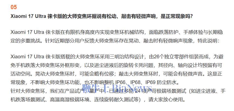 小米表示,17Ultra徕卡版的大师变焦环采用三明治结构设计,由26个独立零部件组装而成。为避免跌落时外框形变及进尘进液后旋转卡死,变焦环的径向和轴向设计预留了可活动空间,因此晃动时会有位移,敲击时会有轻微声响,这属于正常现象,不影响功能及整机IP66、IP68、IP69防尘防水性能。