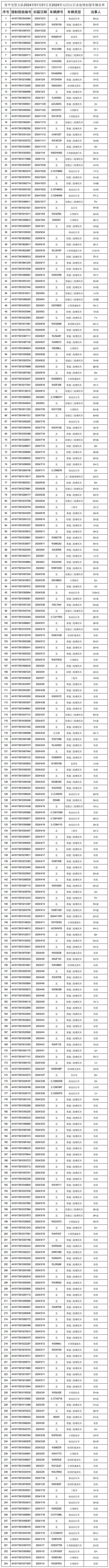 兹有254辆违法车辆、事故车辆于2024年1月1日至2024年12月31日被交管部门在东莞市常平辖区扣留,依据《中华人民共和国道路交通安全法》第一百一十二条和《中华人民共和国道路交通安全法实施条例》第一百零七条的规定,请相关当事人(驾驶人或者所有人、管理人)自本公告发出之日起三个月内,持被扣留车辆的合法证明和补办相应手续来常平交管大队接受处理。逾期不来接受处理的,对扣留的车辆依法处理。