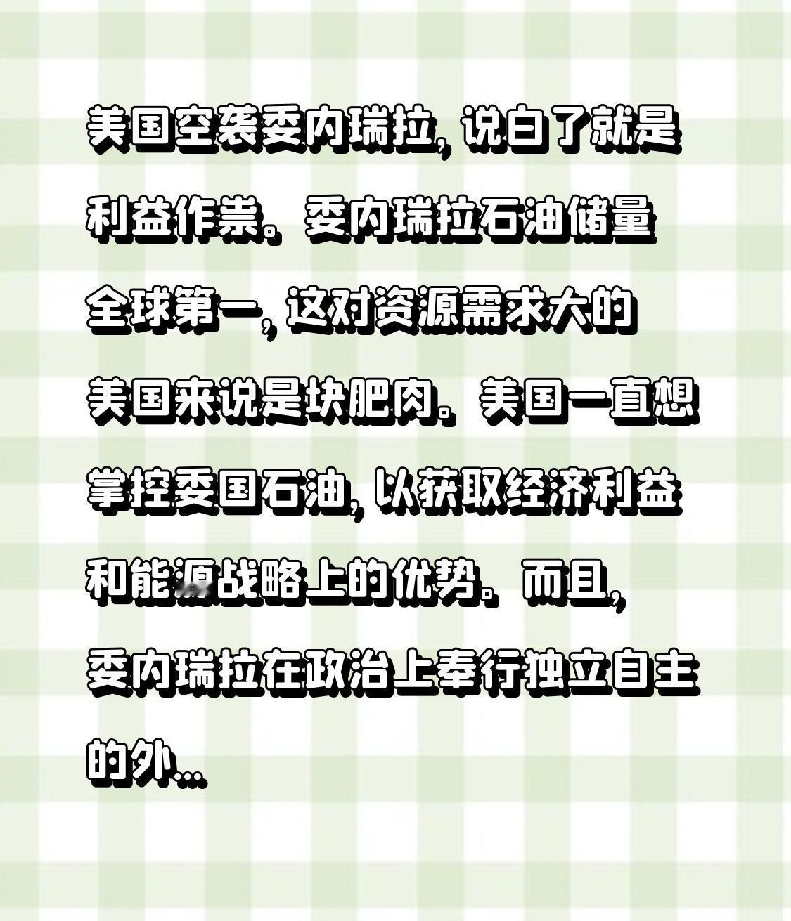 美国空袭委内瑞拉,说白了就是利益作祟。委内瑞拉石油储量全球第一,这对资源需求大的美国来说是块肥肉。美国一直想掌控委国石油,以获取经济利益和能源战略上的优势。 而且,委内瑞拉在政治上奉行独立自主的外交政策,不怎么听美国摆布。美国就想通过军事手段,扶植亲美政权,这样就能更好地控制委内瑞拉。美国长期对委实施经济制裁、政治打压,空袭也是其霸权主义的又一恶劣手段,为了自身利益,完全不顾他国主权和人民死活。